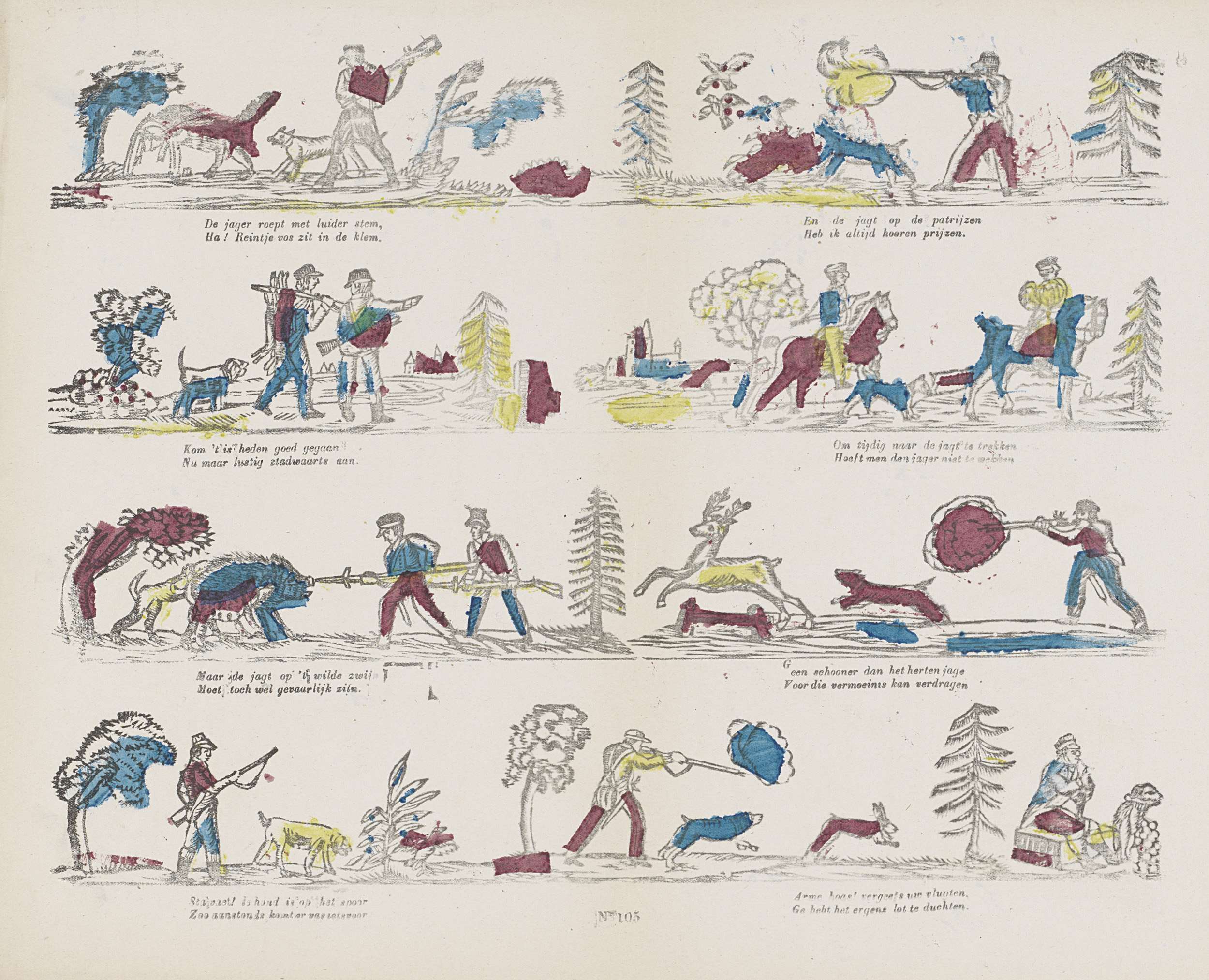 Blad met 4 jachttaferelen. Onder elke voorstelling een vierregelig vers in twee kolommen. Genummerd midden onder: No. 105.