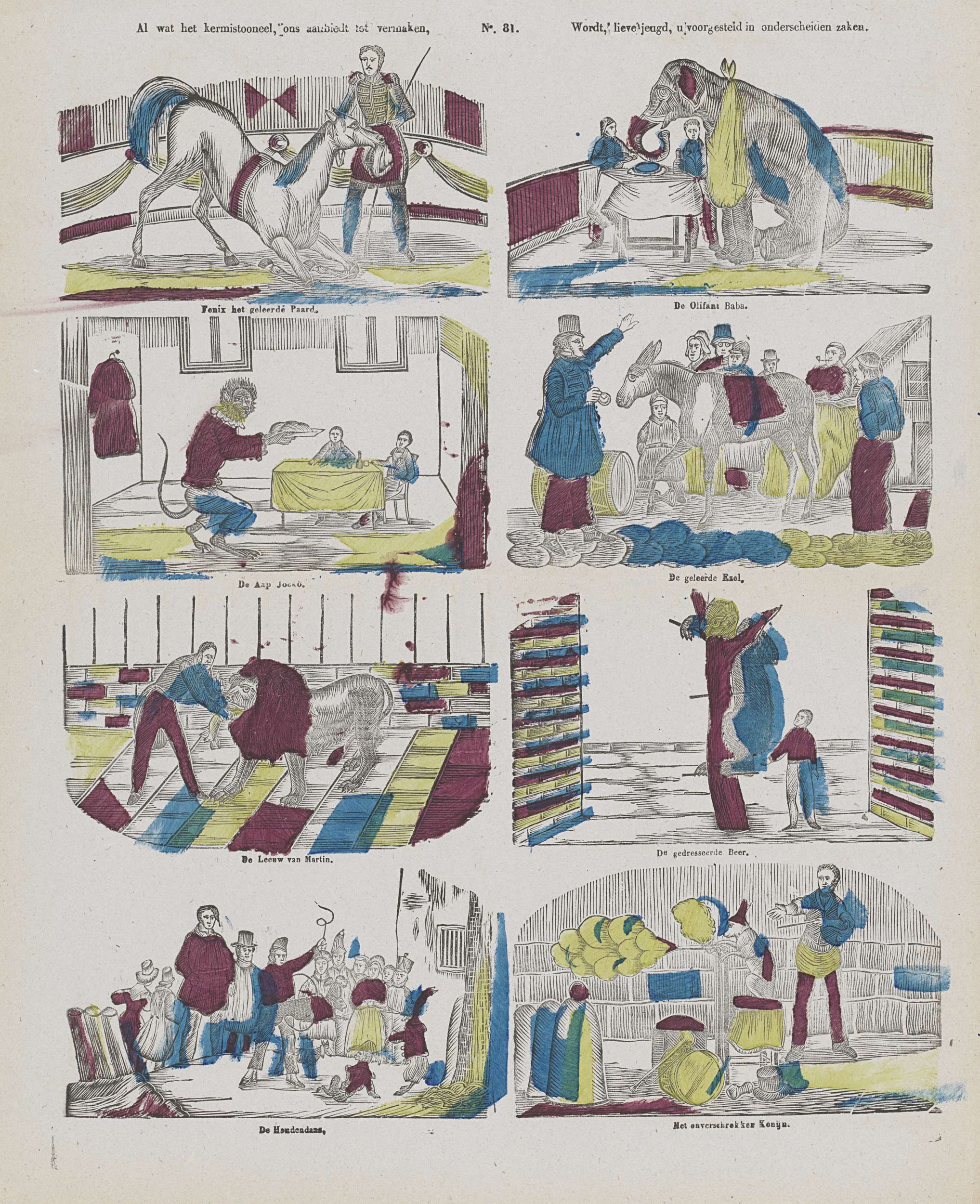 Blad met 8 voorstellingen van circusdieren. Onder elke afbeelding een onderschrift. Genummerd midden boven: No. 81.