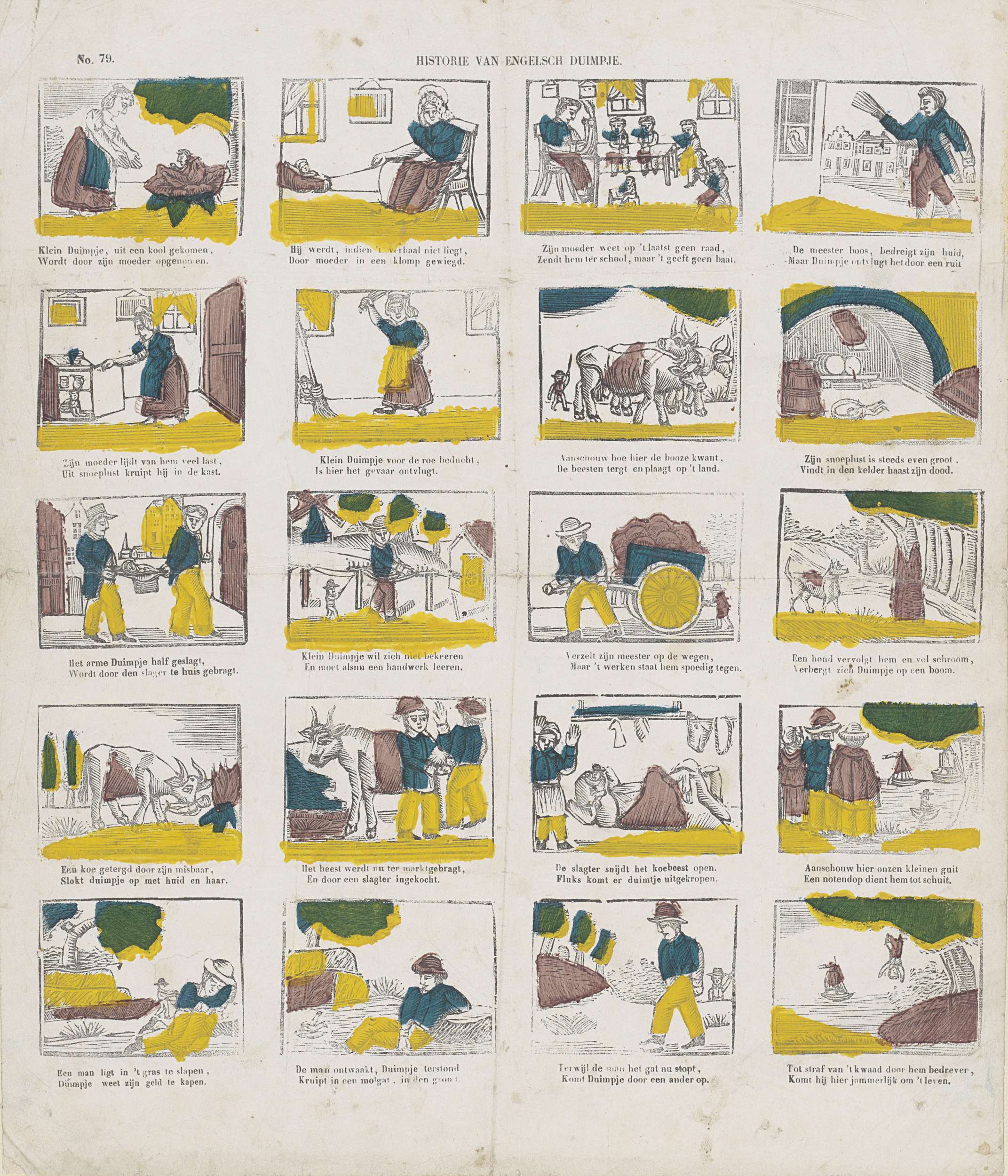 Blad met 20 voorstellingen uit het sprookje van Klein Duimpje. Onder elke afbeelding een tweeregelig vers. Genummerd linksboven: No. 79.