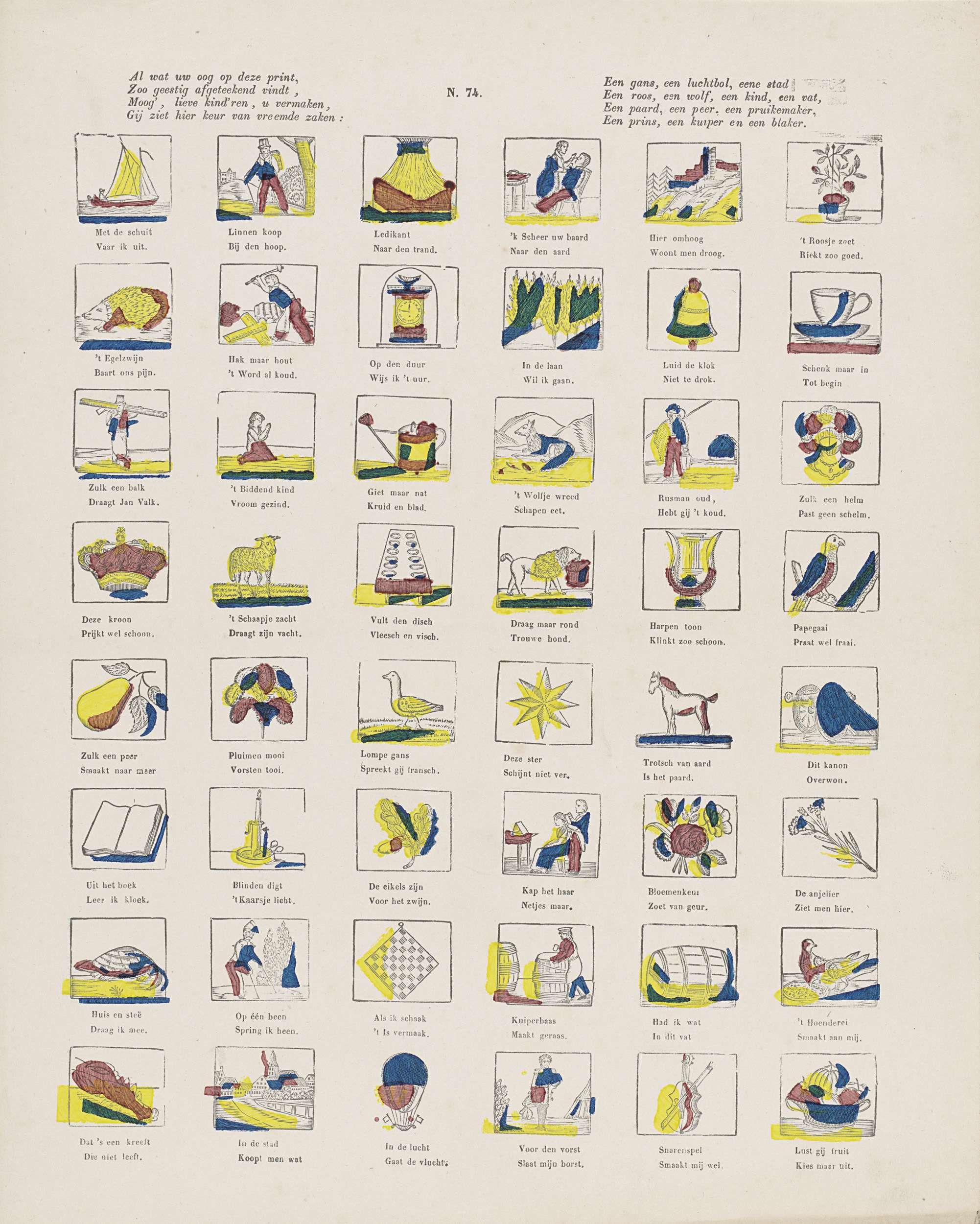 Blad met 48 voorstellingen van voorwerpen, figuren en dieren. Onder elke voorstelling een tweeregelig vers. Genummerd midden boven: N. 74.