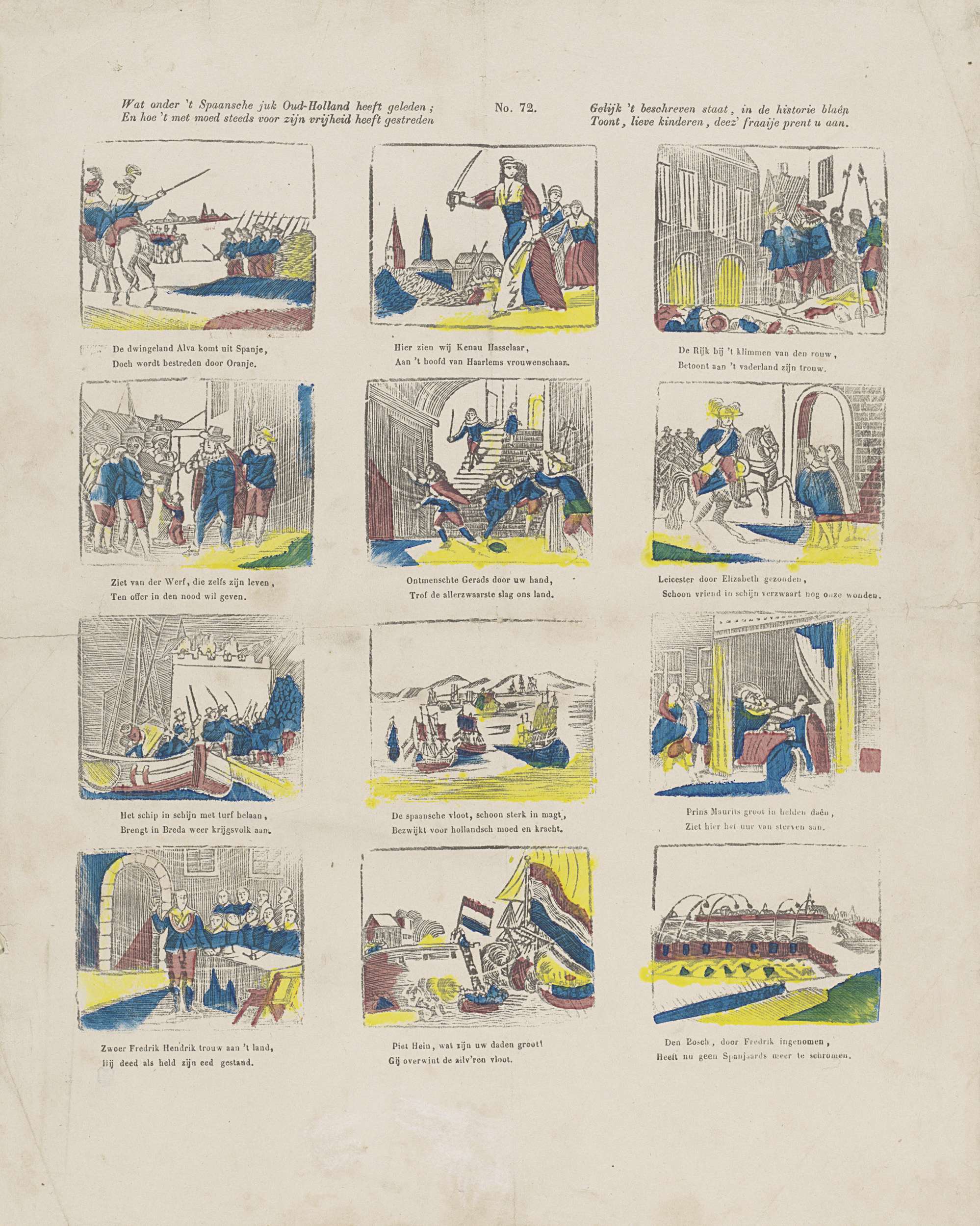 Blad met 12 voorstellingen van gebeurtenissen uit de Tachtigjarige Oorlog in de zeventiende eeuw. Onder elke voorstelling een tweeregelig vers. Genummerd midden boven: No. 72.