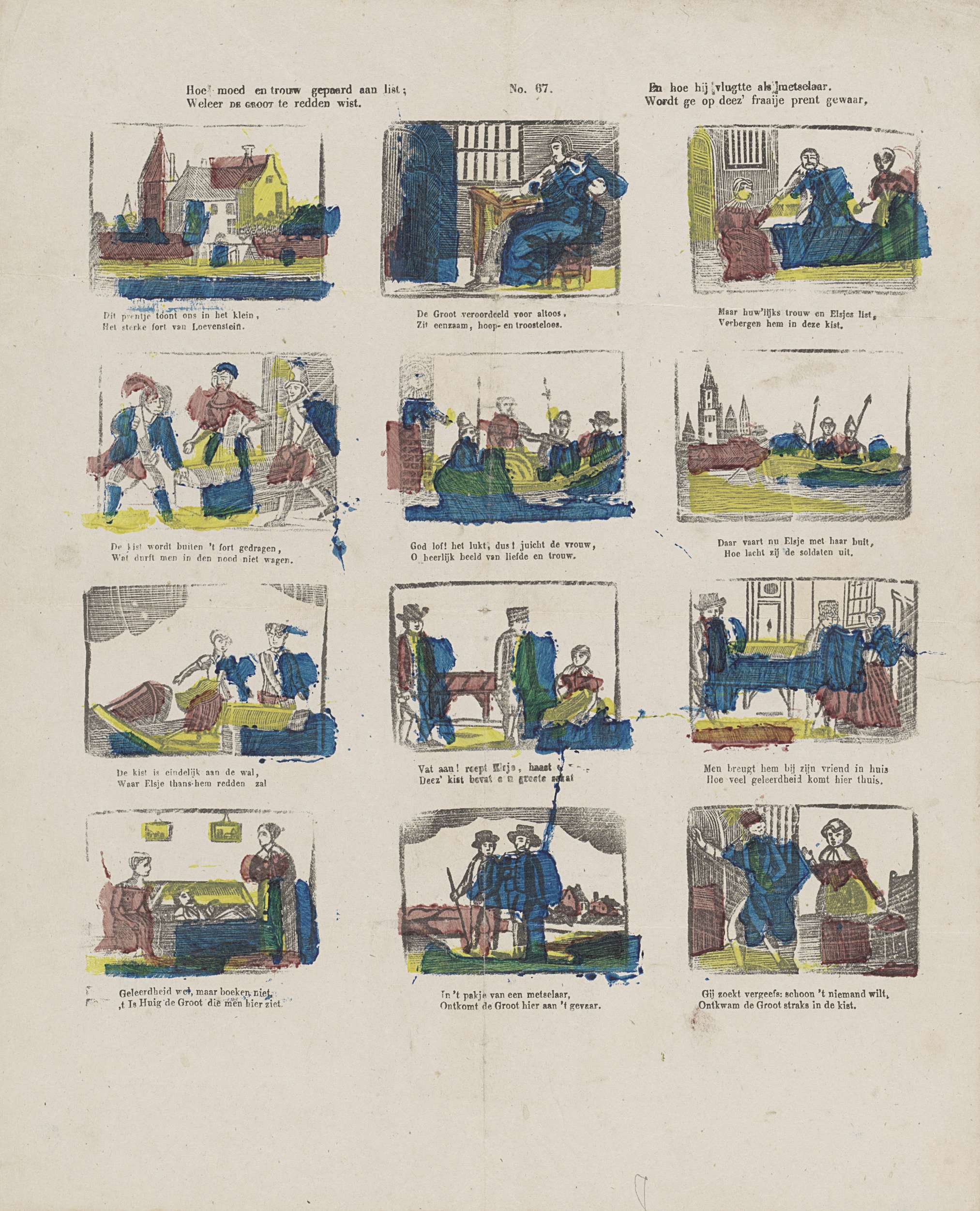 Blad met 12 voorstellingen over de ontsnapping van Hugo de Groot uit Slot Loevestein verstopt in een boekenkist, op 22 maart 1621. Onder elke afbeelding een tweeregelig vers. Genummerd midden boven: No. 67.