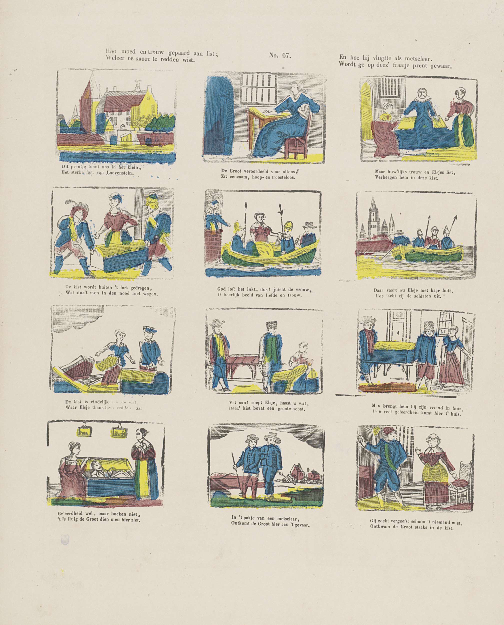 Blad met 12 voorstellingen over de ontsnapping van Hugo de Groot uit Slot Loevestein verstopt in een boekenkist, op 22 maart 1621. Onder elke afbeelding een tweeregelig vers. Genummerd midden boven: No. 67.
