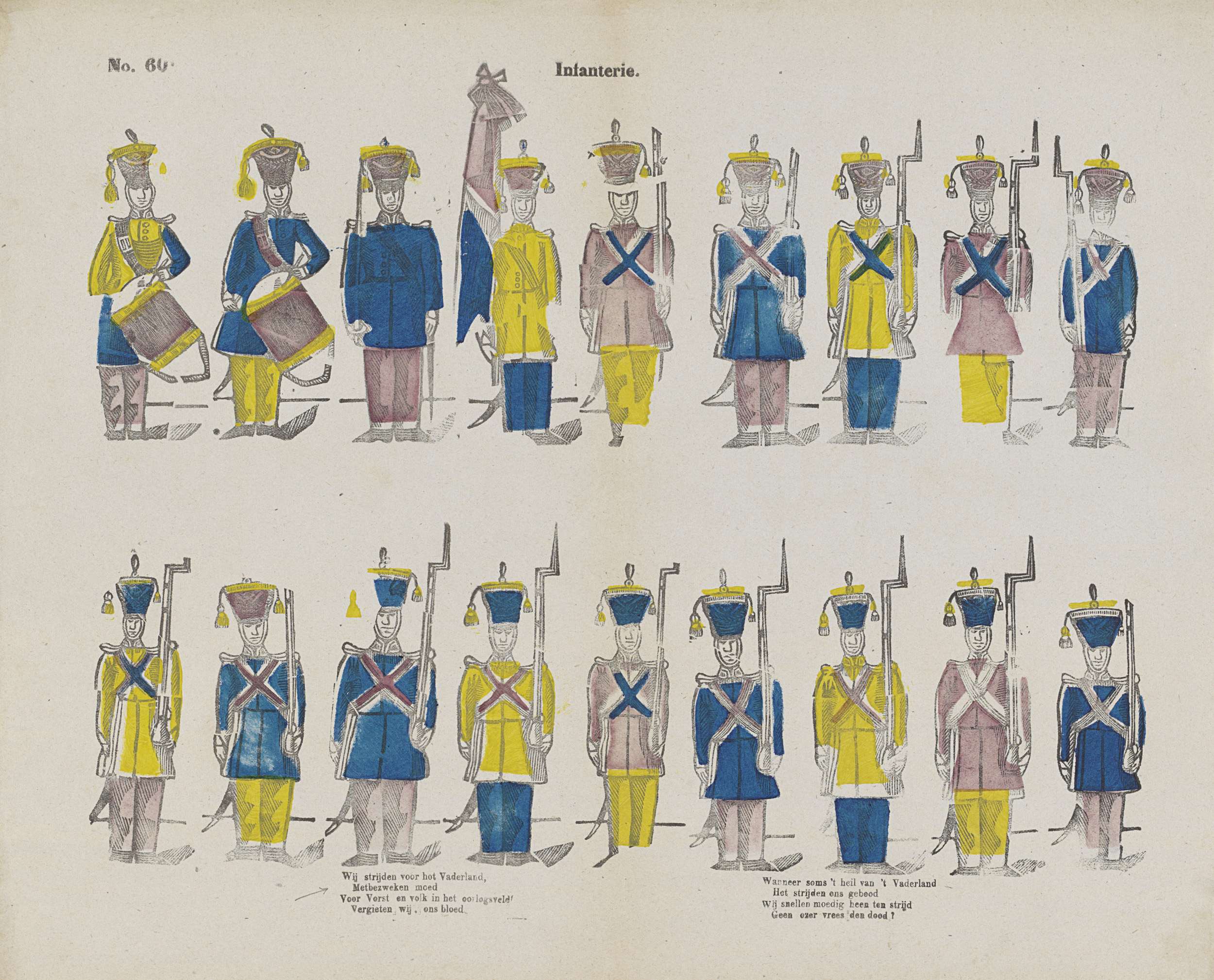 Blad met 2 horizontale rijen met voorstellingen van militairen. In de ondermarge een vers in twee kolommen. Genummerd linksboven: No. 60.
