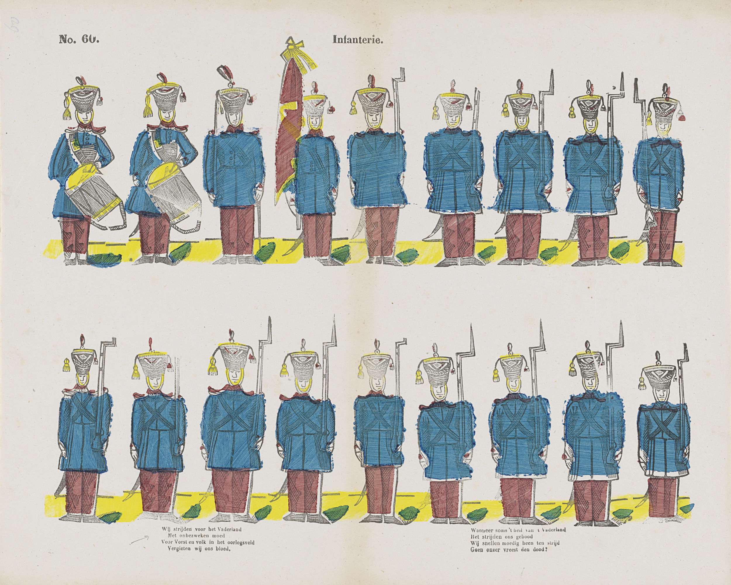Blad met 2 horizontale rijen met voorstellingen van militairen. In de ondermarge een vers in twee kolommen. Genummerd linksboven: No. 60.