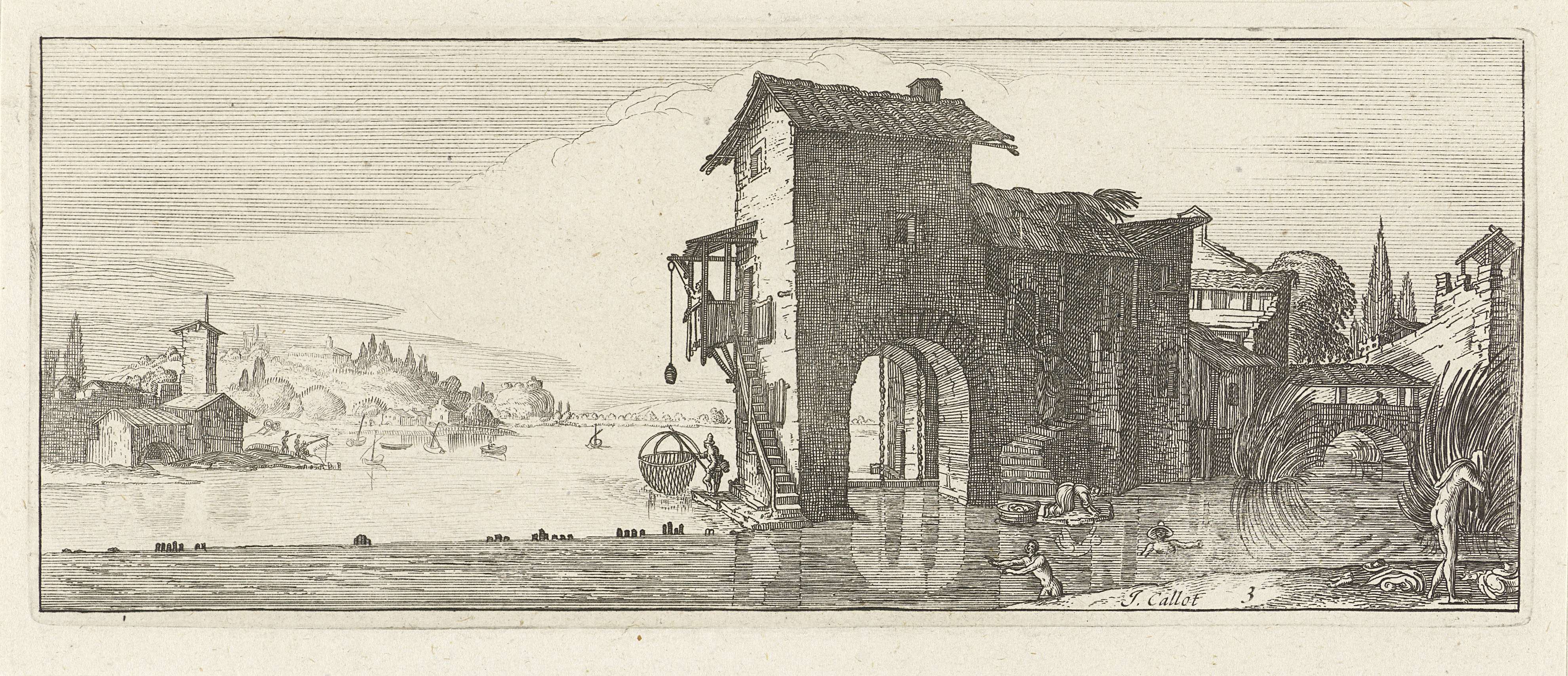 Een watermolen aan een rivier of baai. Op de voorgrond rechts enkele zwemmers en wasvrouwen. Op de achtergrond links een heuvelachtig landschap met enkele huizen. Deze prent is onderdeel van een serie van vier lanschapsprenten.