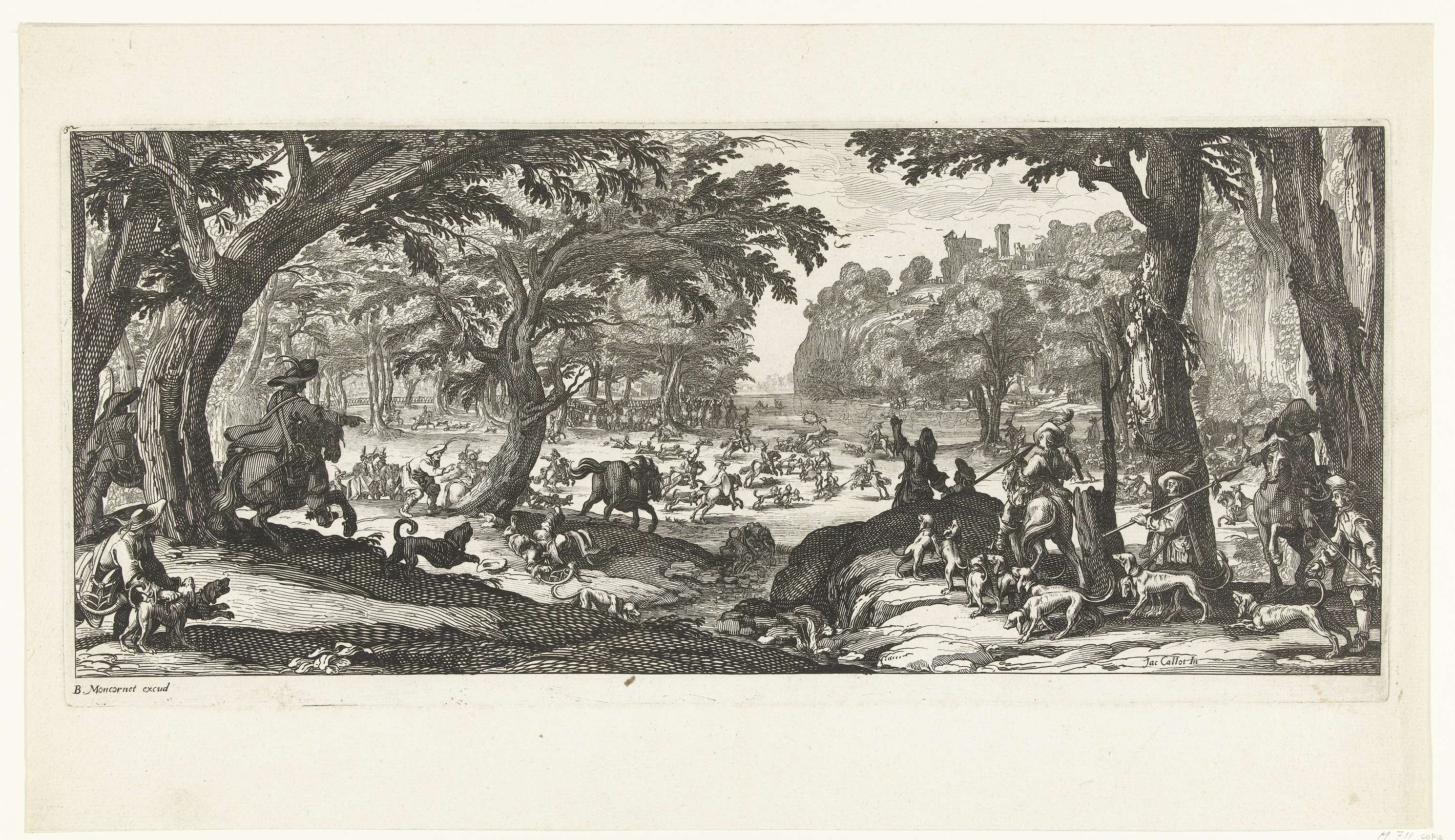In een bomenrijk gebied aan een water jagen vele jagers met hun knechten en honden op een hert. Rechts op de achtergrond een burcht op een berg.