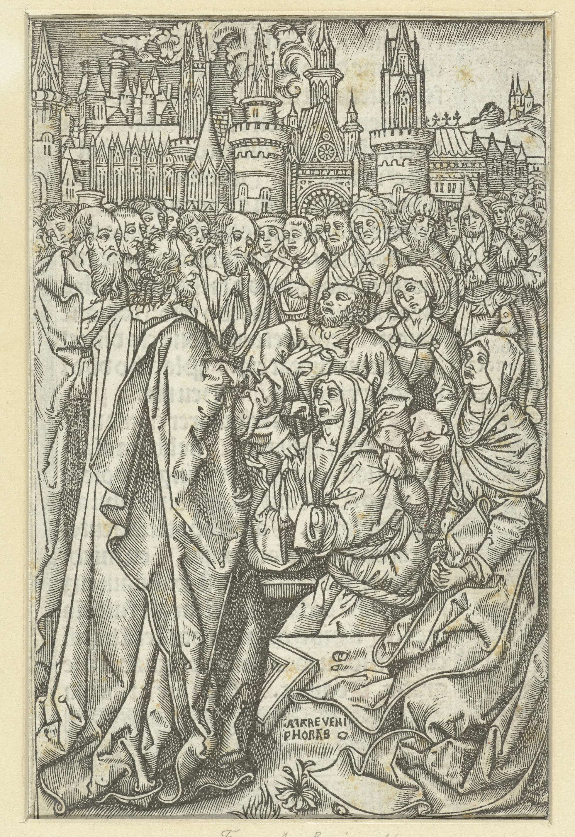 Christus, op de rug gezien, wekt Lazarus tot leven. Deze komt uit het graf omhoog. Een grote groep omstanders kijkt toe.