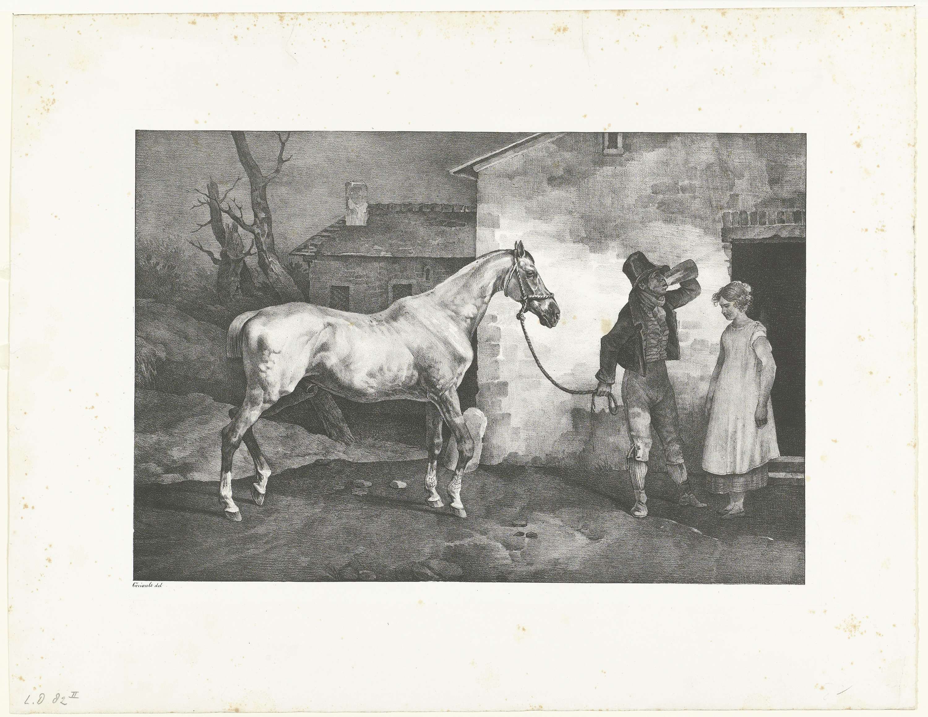 Een man staat met zijn paard aan een touw bij een herberg. Hij drinkt uit een beker, naast hem een meisje. Uit een serie van twaalf prenten.
