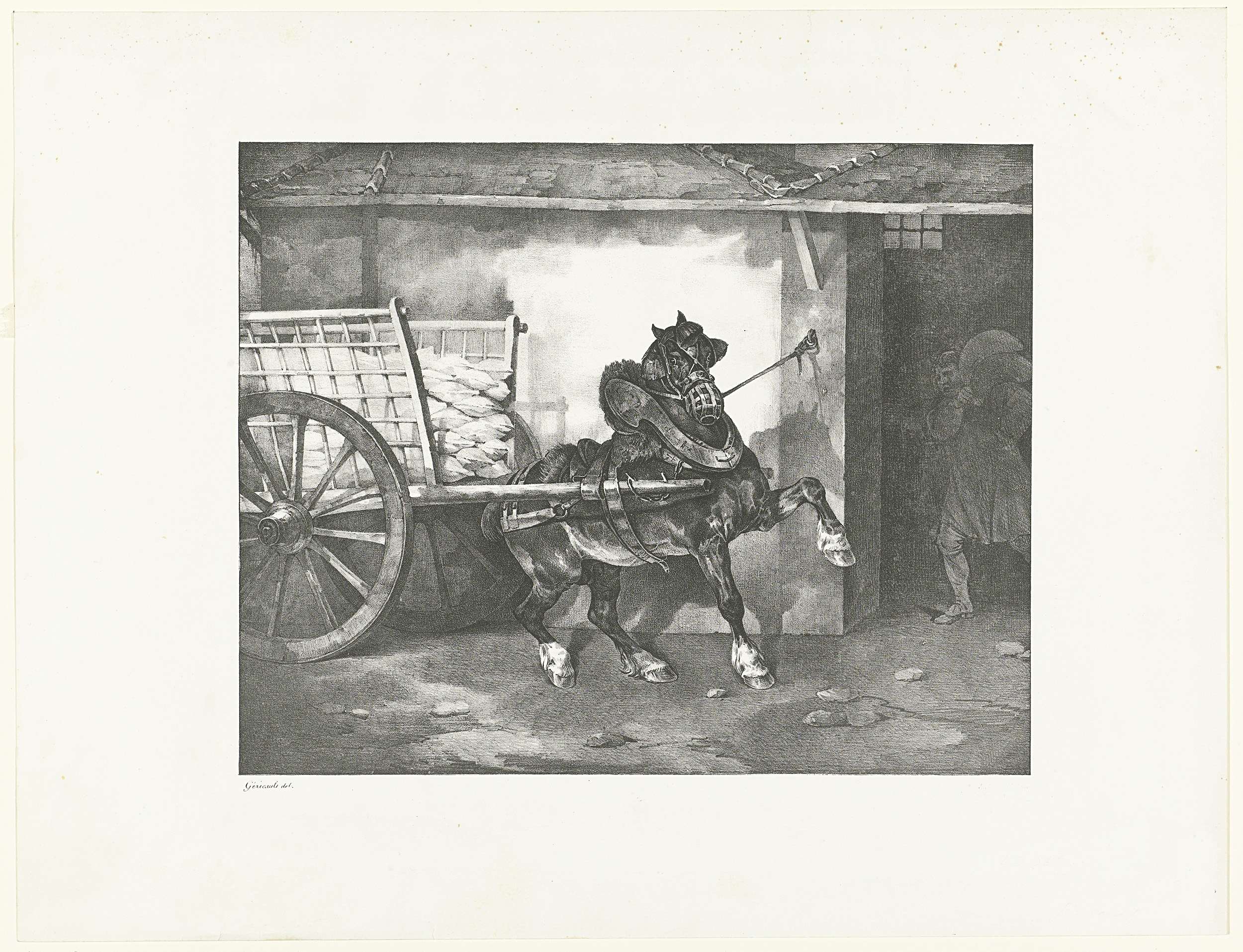Een onrustig paard, met een muilkorf om, ingepannen voor een kar. De stukadoor komt aanlopen, twee zakken op zijn schouder dragend. Uit een serie van twaalf prenten.