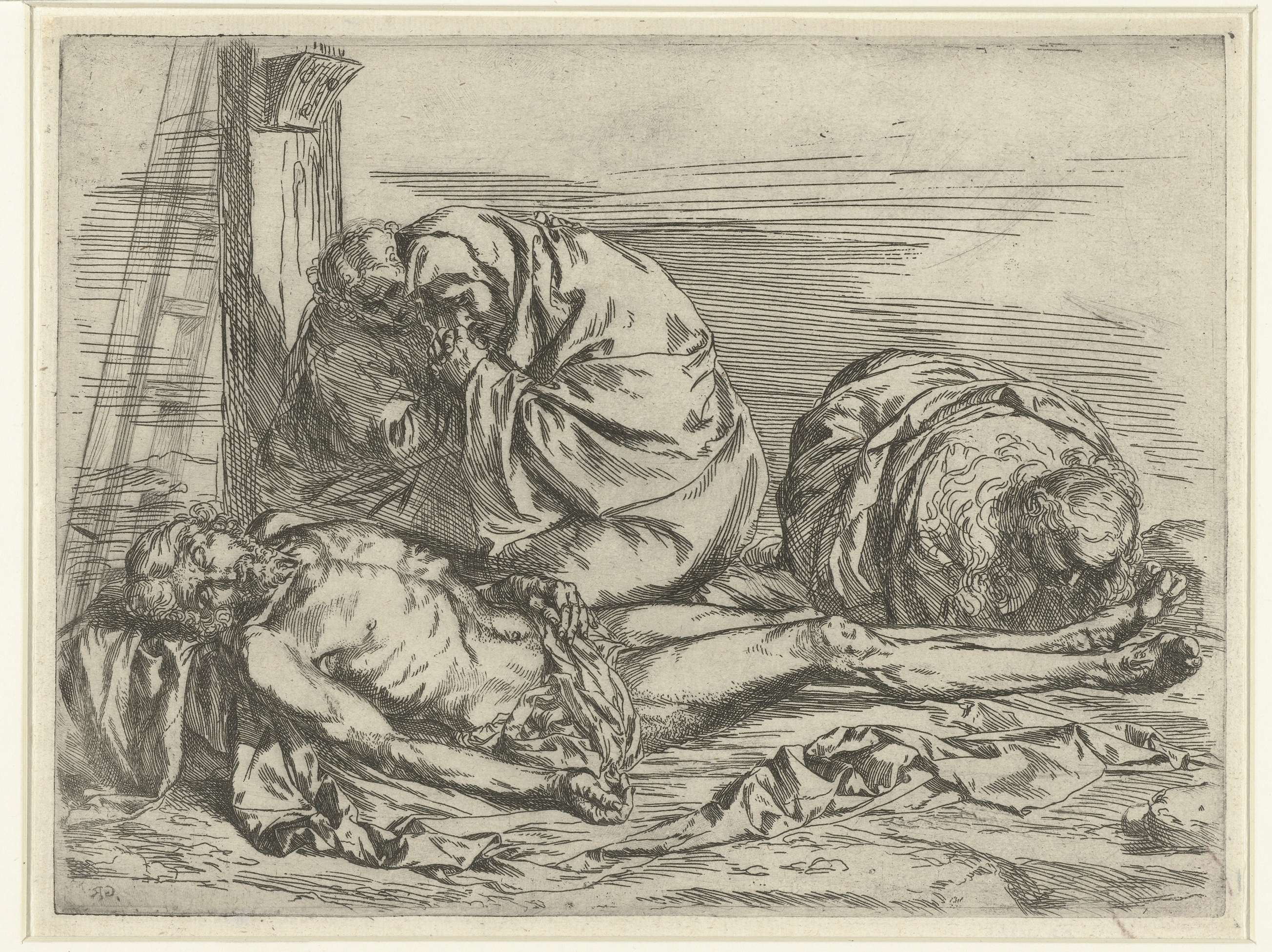Maria, ondersteund door Johannes, en Maria Magdalena knielen bij het lichaam van Christus.