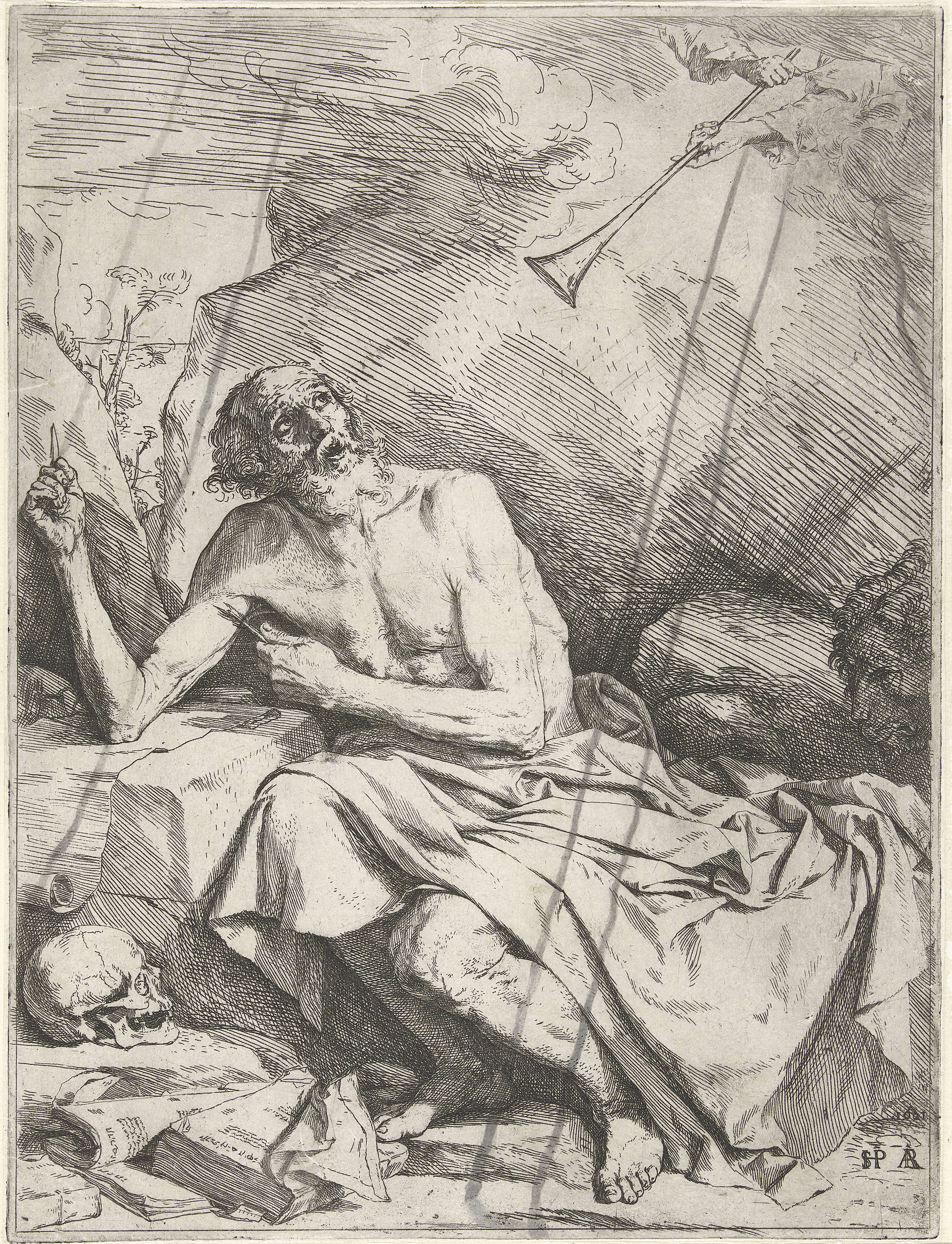 De heilige Hieronymus zittend in de wildernis, met zijn boeken, een schedel en de leeuw. Uit een wolk aan de hemel steken twee handen die een trompet vasthouden.