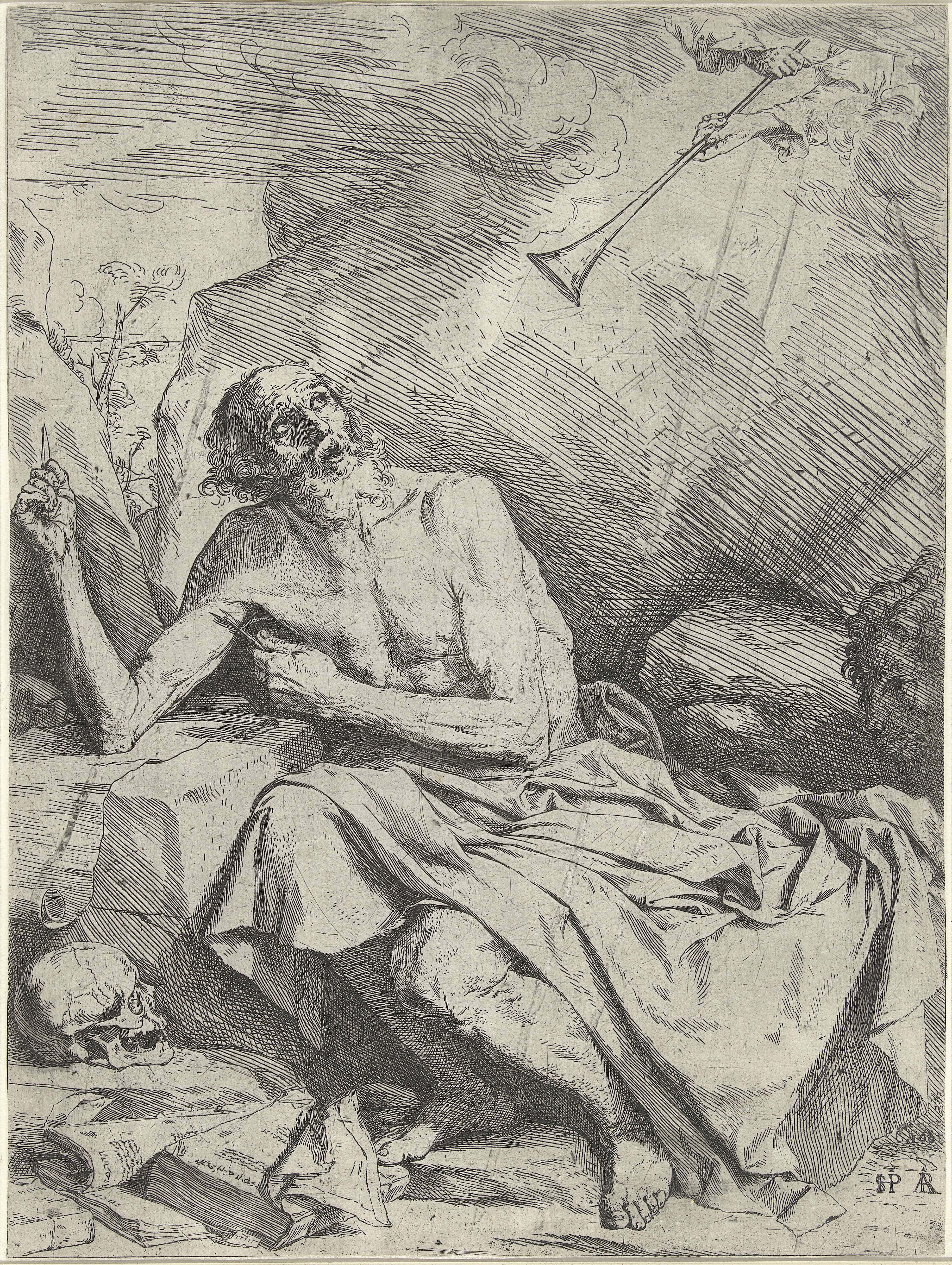 De heilige Hieronymus zittend in de wildernis, met zijn boeken, een schedel en de leeuw. Uit een wolk aan de hemel steken twee handen die een trompet vasthouden.