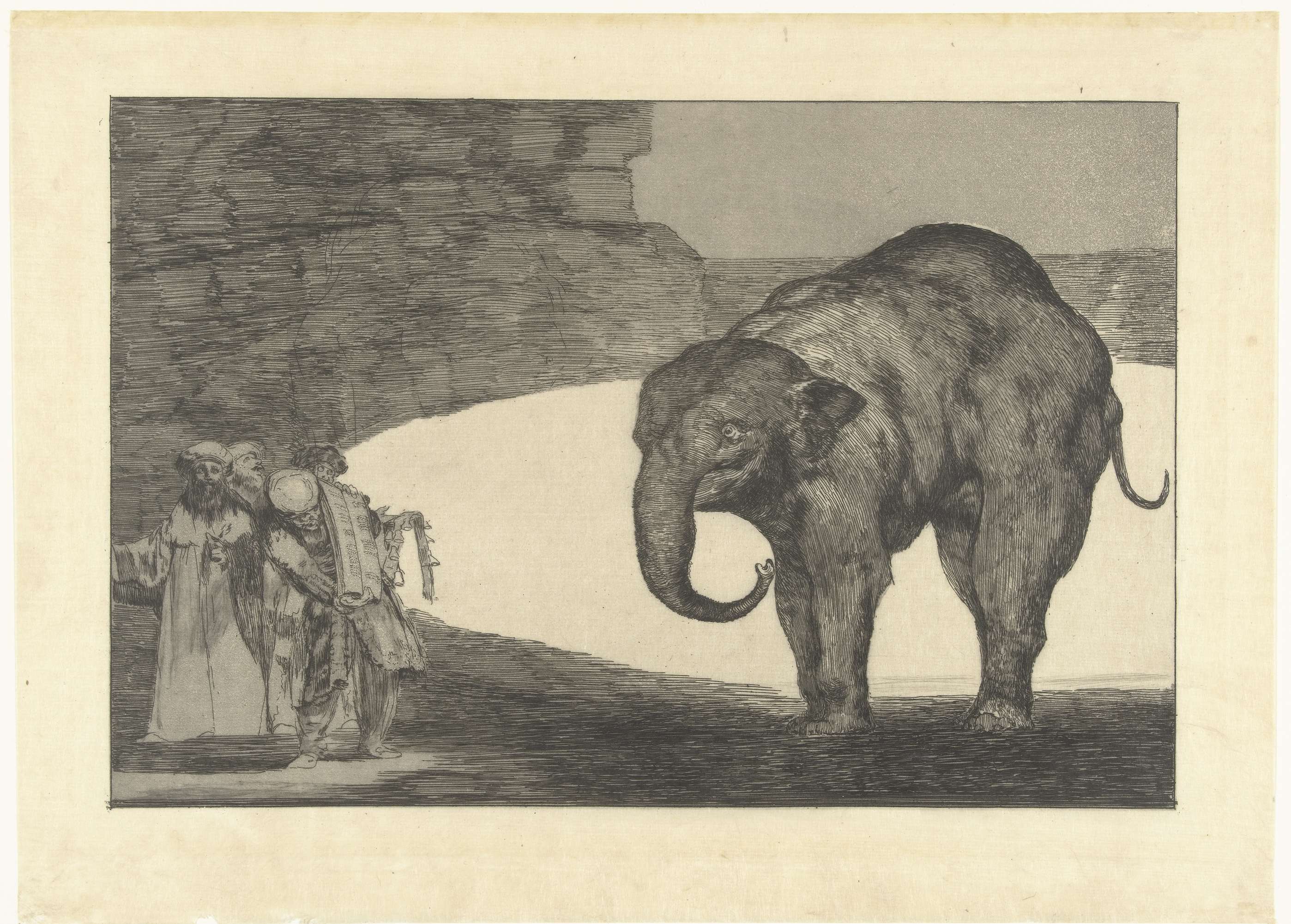 Vier mannen tonen een olifant een boek en een koord met bellen. Een van de vier extra platen gemaakt voor de serie Los Desparates.