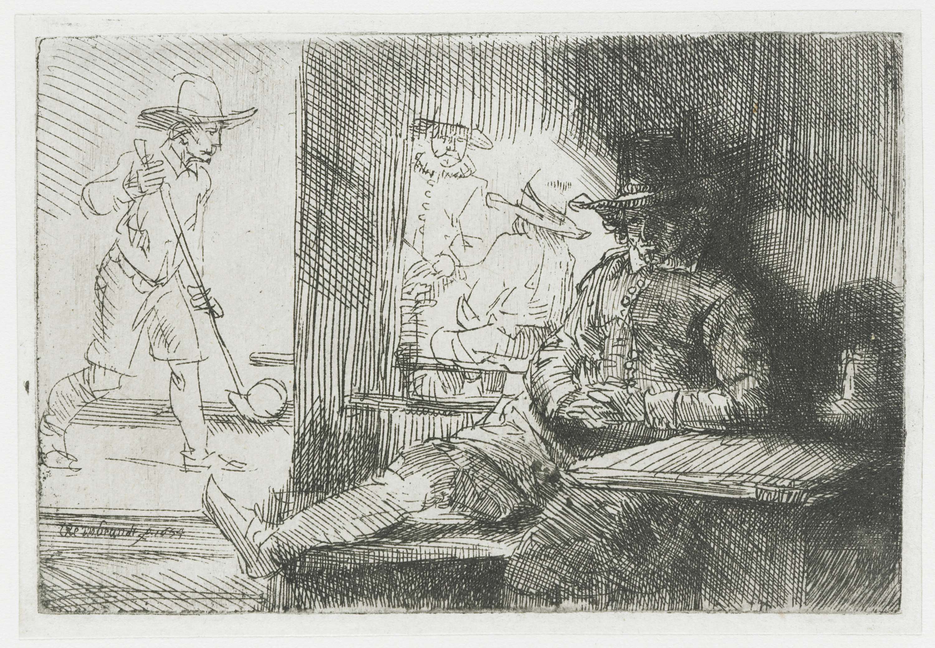 De man die een bal voortduwt is aan het beugelen. Bij dat spel moet de bal op een baan door een ring worden geschoten. In de 17de eeuw was het een populair tijdverdrijf en banen lagen vaak bij kroegen en herbergen. De overige figuren zijn daarom ongetwijfeld tapgasten, die Rembrandt uitzonderlijk vrij in de etsgrond ...