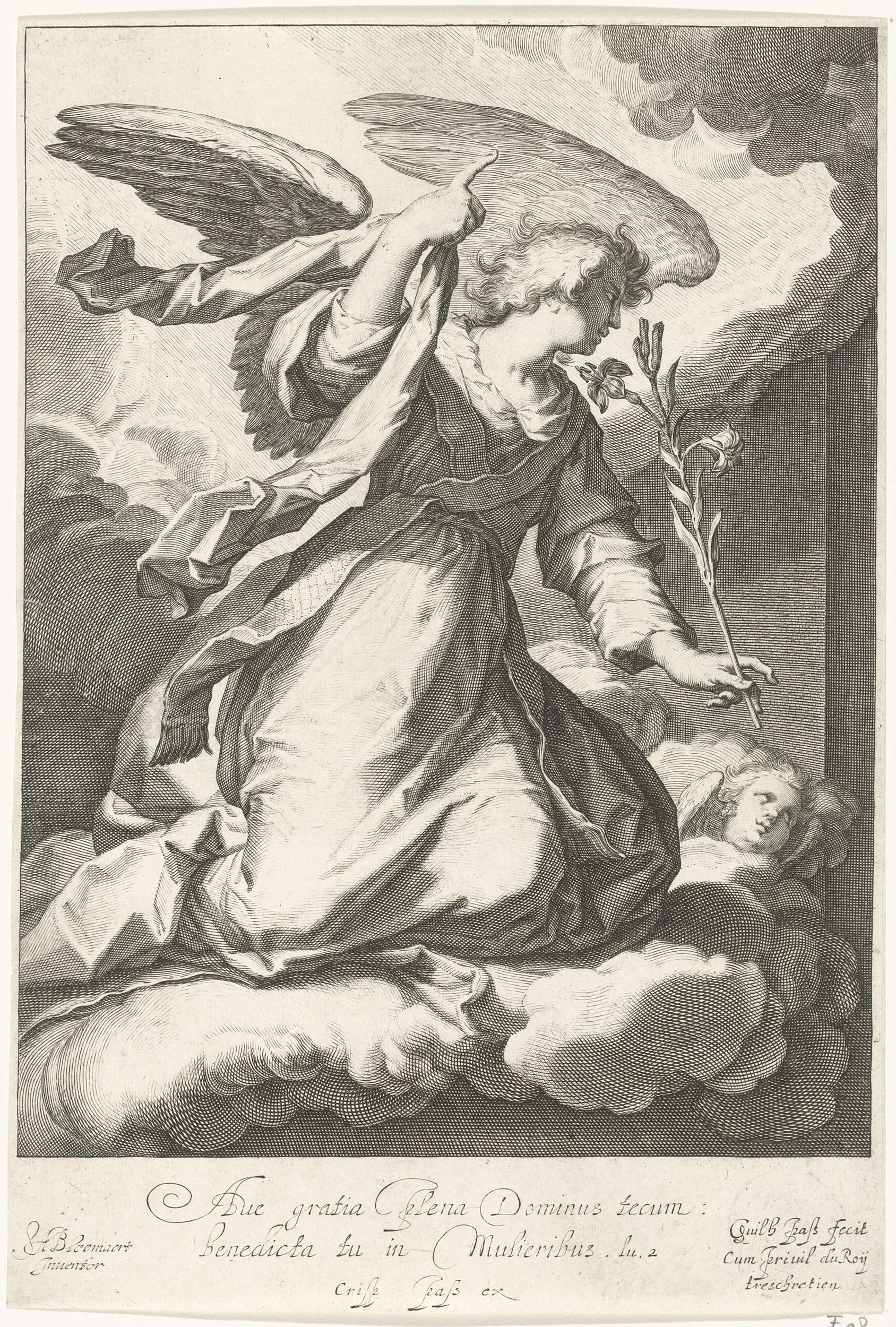De aartsengel Gabriël op een wolk. In zijn linkerhand houdt hij een lelie en zijn rechterhand is opgeheven. In de marge een tweeregelig onderschrift in het Latijn.