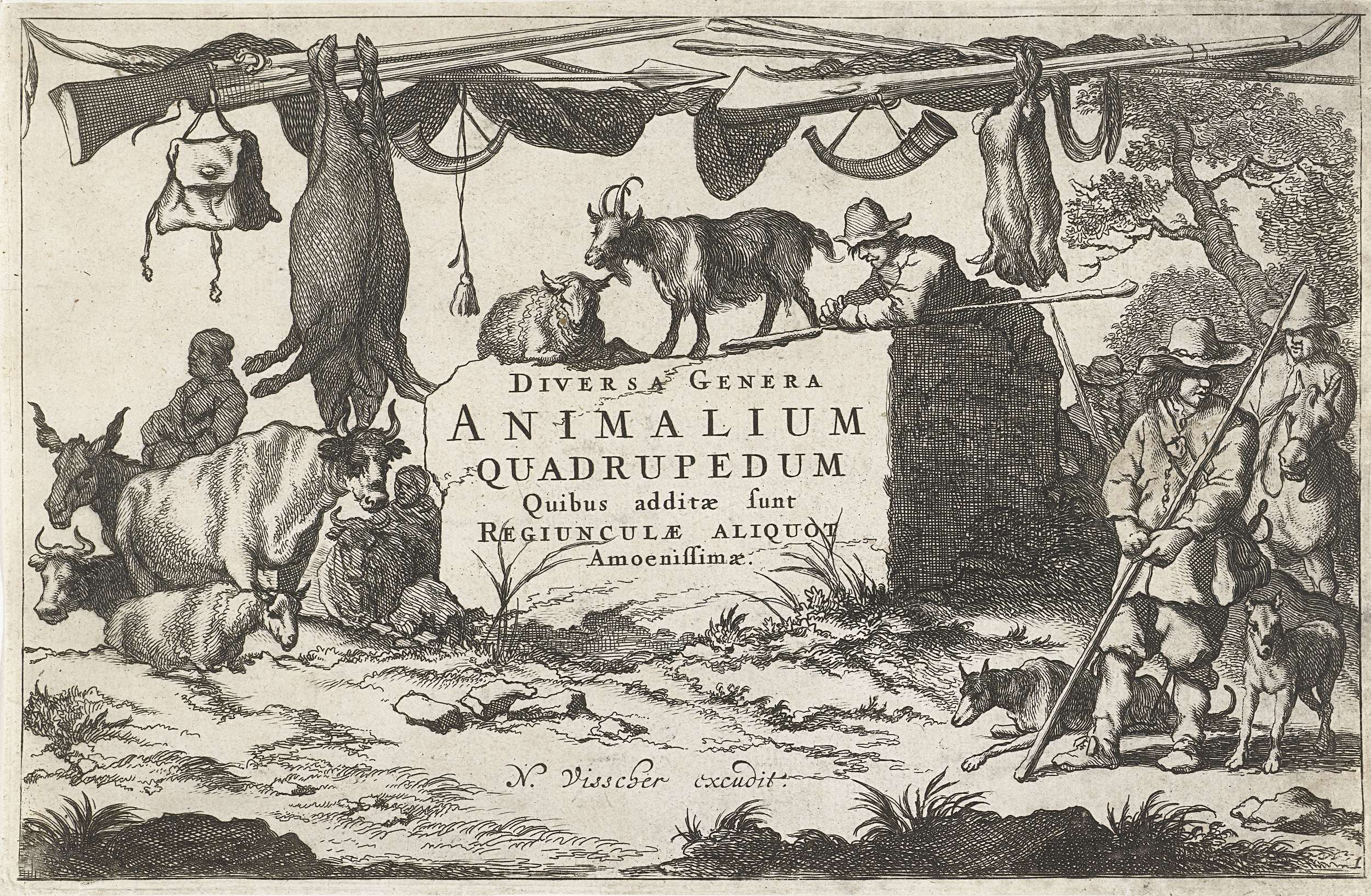 Centraal op een stenen blok de Latijnse titel van de serie en de naam van de uitgever. Rondom de titel staan herders met koeien, schapen en geiten. Bovenaan de prent enkele jachtwapens en geschoten wild als ornamenten. Deze prent is de titelprent van een serie over vierpotige dieren.