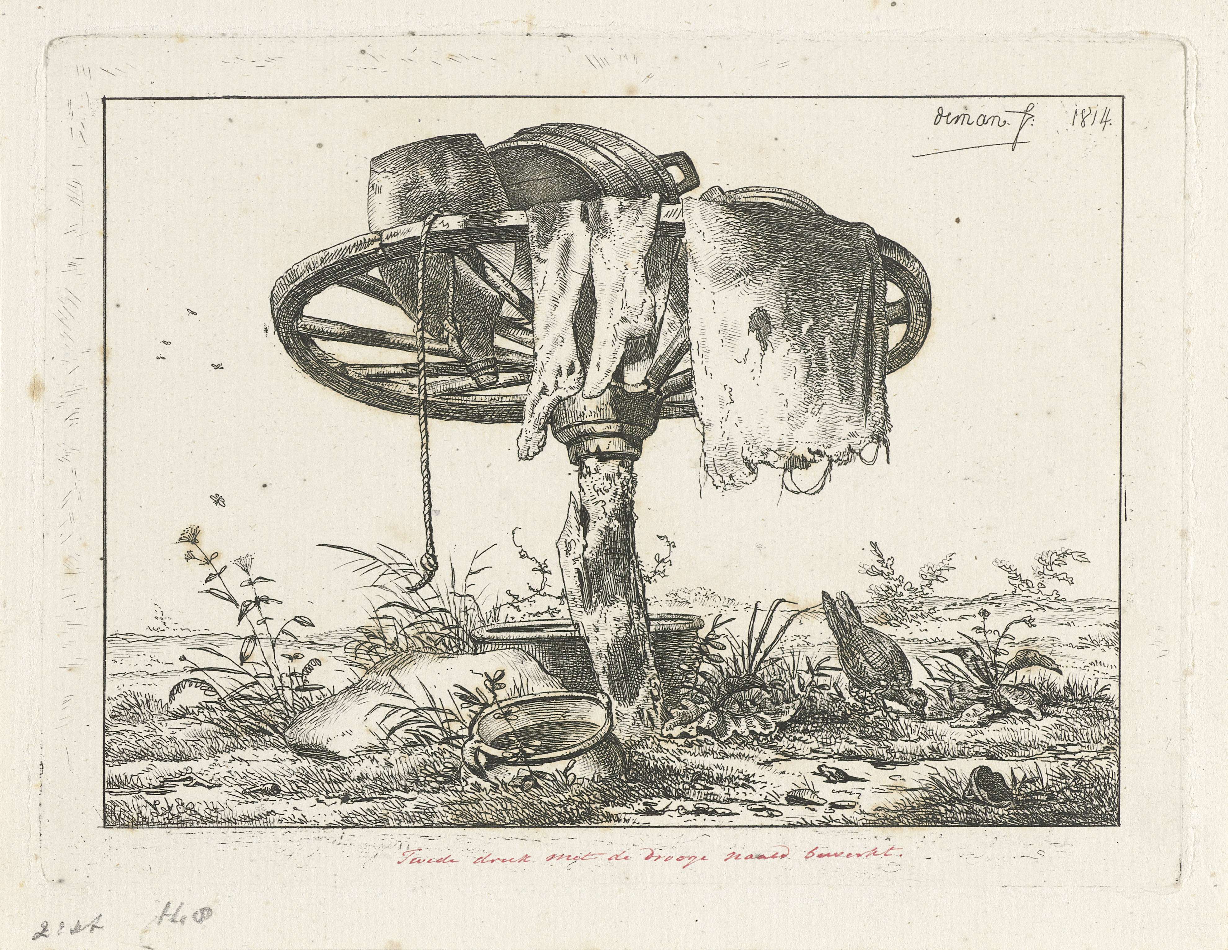 Een wagenwiel op een boomstam, met erop kledingstukken, een kruik en een tobbe. Rechts een kip.