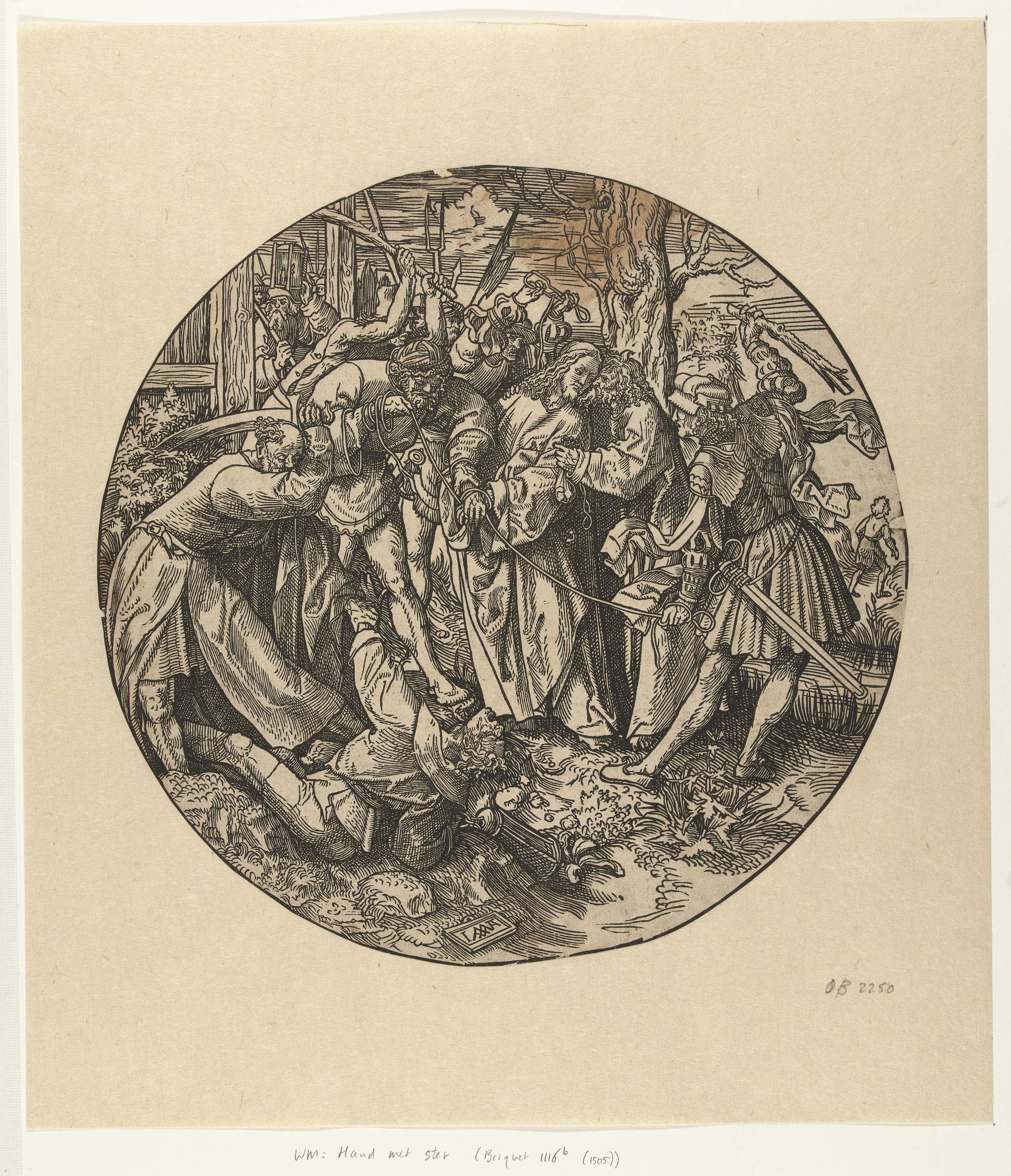 Uit serie van twaalf prenten. Omlijsting weggesneden. Judas kust Christus die door soldaten wordt geboeid. Petrus met geheven zwaard, valt Malchus aan.