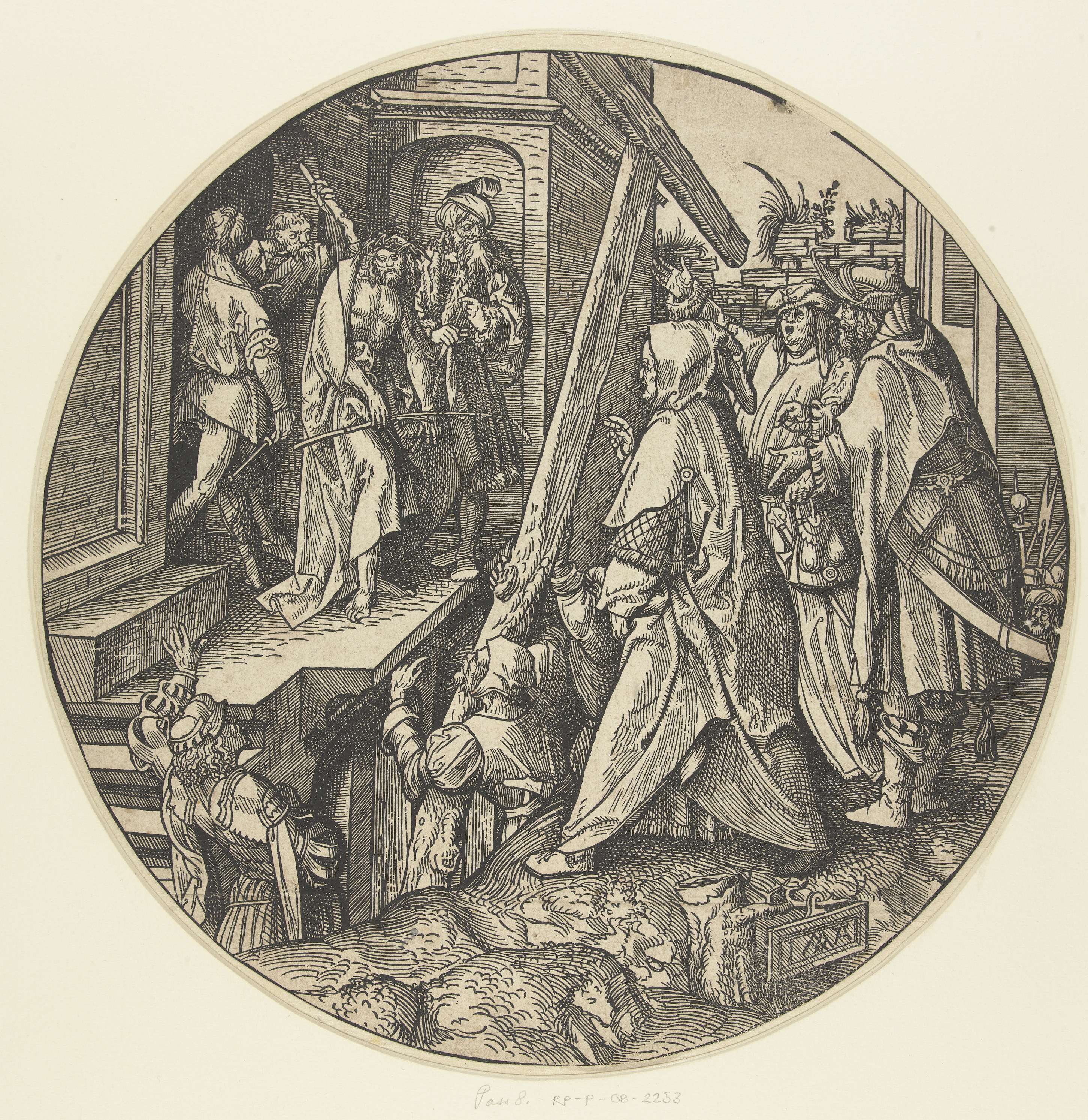 Uit serie van twaalf prenten, omlijsting weggesneden. Christus met doornkroon wordt door Pilatus getoond. Man houdt kruis vast, menigte wijst er naar.