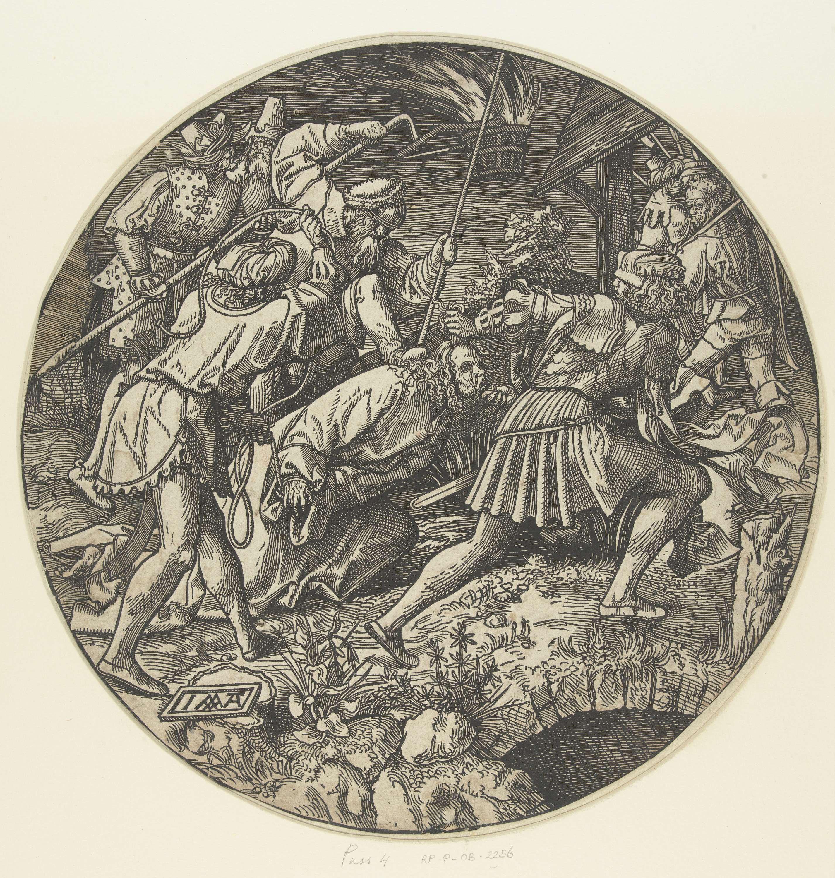 Uit serie van twaalf prenten, omlijsting weggesneden. Christus wordt weggevoerd en geslagen.