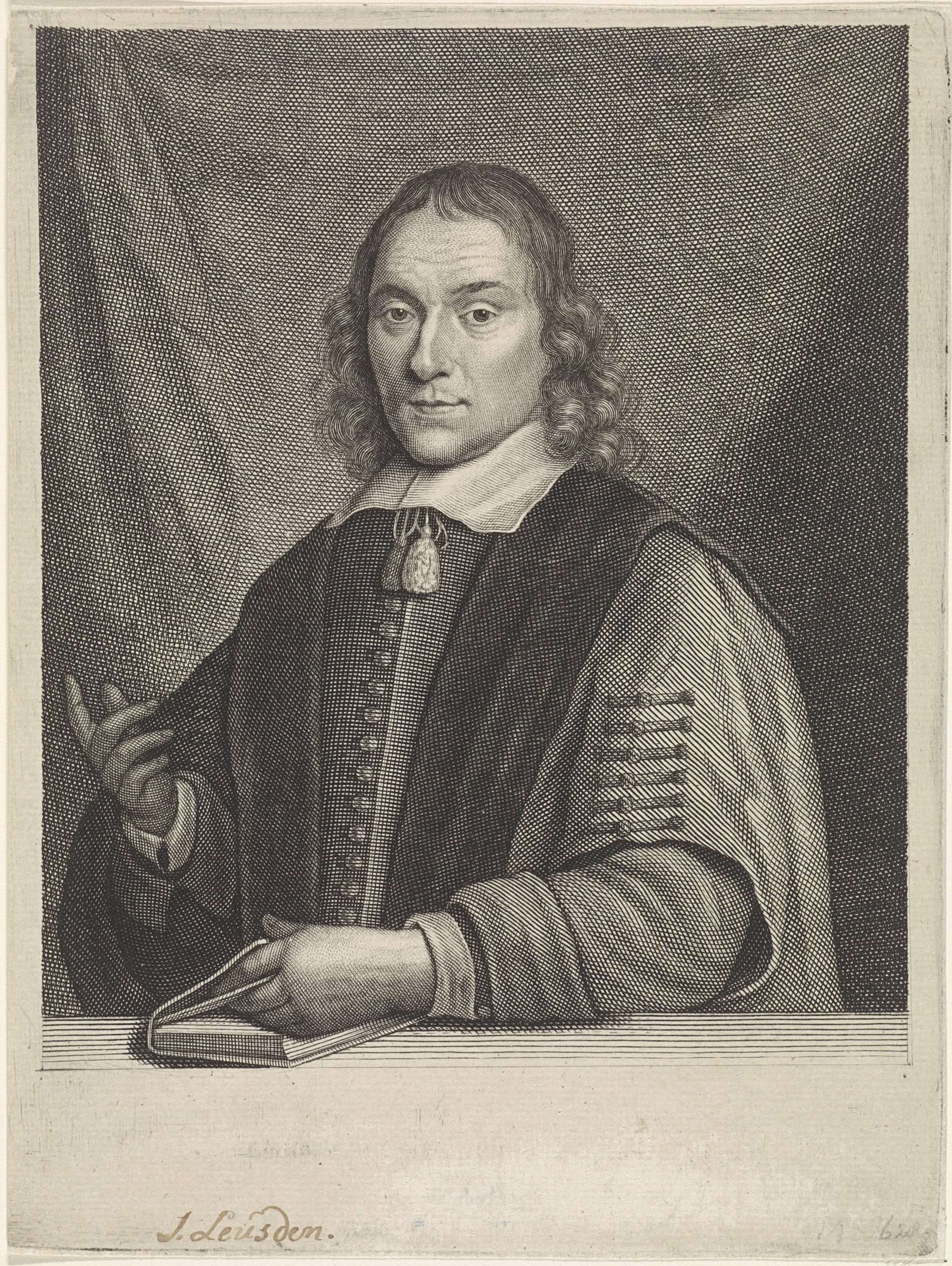 Portret van Johannes Leusden, theoloog en professor te Utrecht. Met zijn rechterhand maakt hij een spreekgebaar.