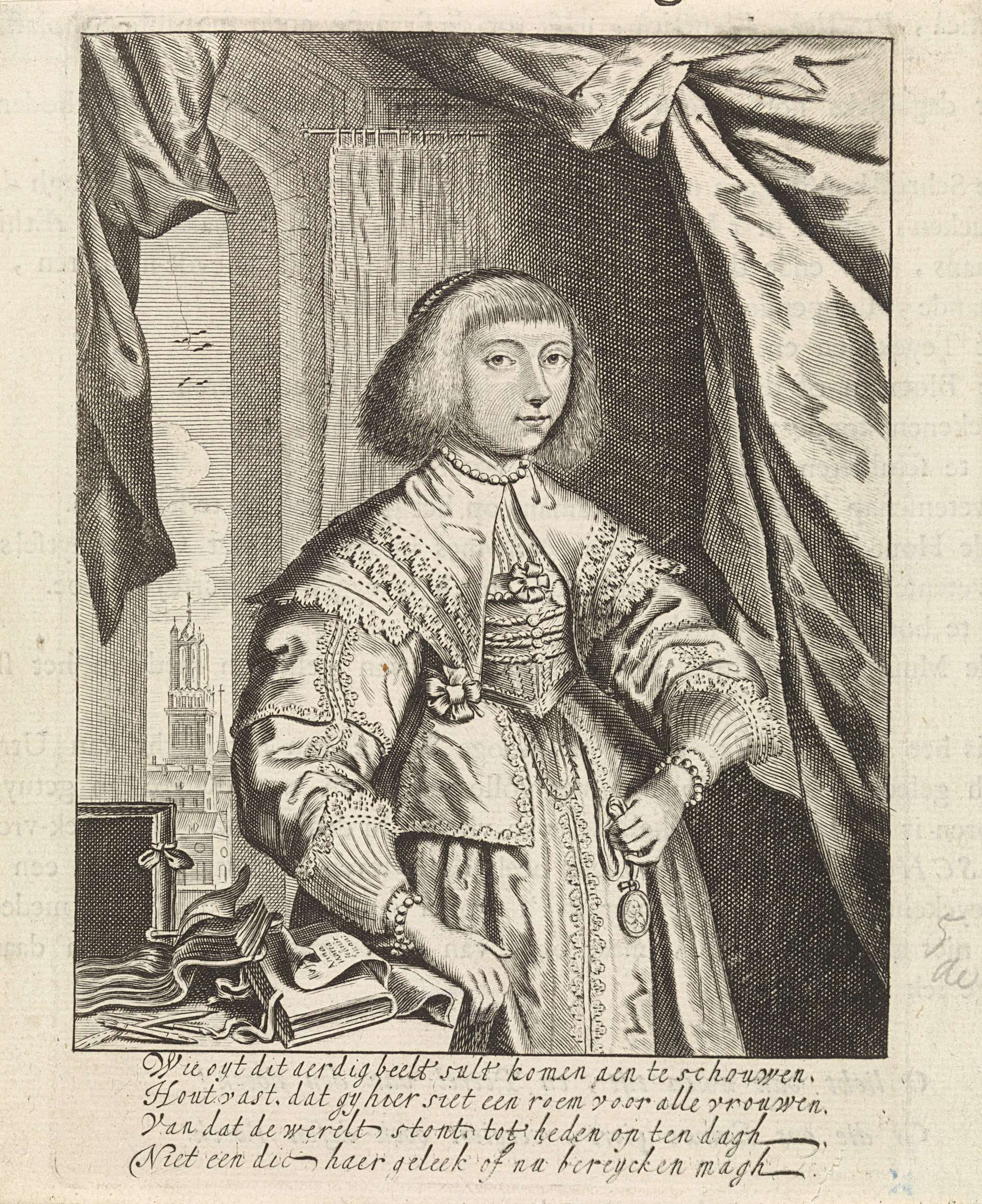 Portret van de dichteres en prentmaker Anna Maria van Schurman, staand bij een tafel in een vertrek. In haar hand een medaillon met haar eigen beeldtenis en op de achtergrond de Domkerk te Utrecht.