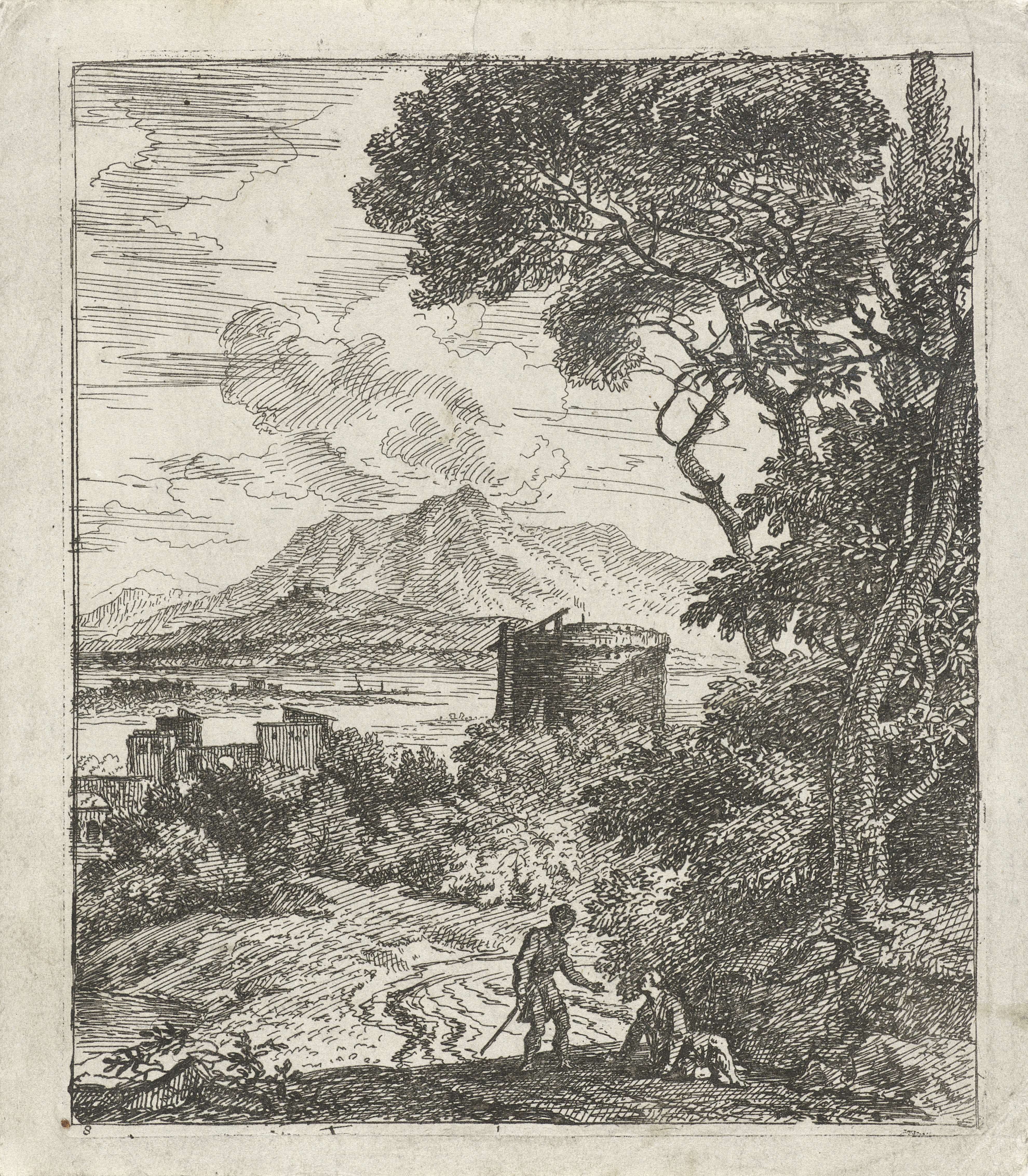 Op een landweg spreekt een man een zittende figuur aan. Op de achtergrond gebouwen en bergen. Linksonder genummerd: 8.