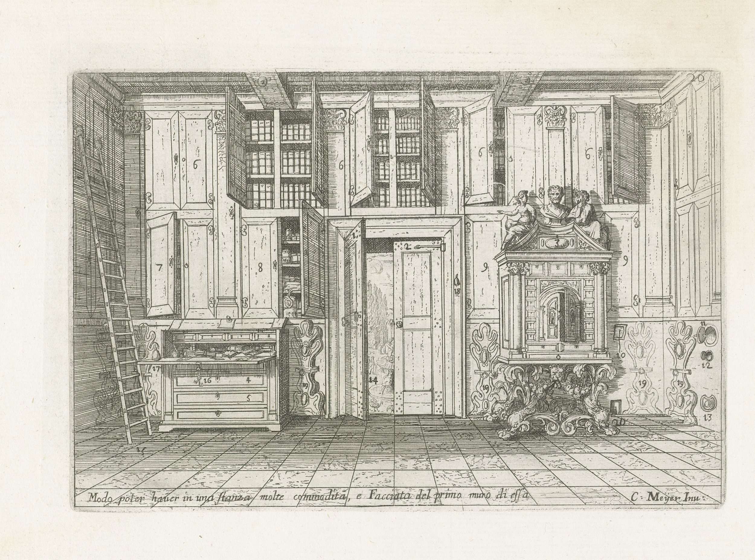 Aanzicht van een van de vier muren van een kamer, met diverse genummerde opbergmogelijkheden in de wand. In de wandkasten zijn boeken opgeborgen. Links een bureau waarop verschillende boeken liggen; rechts een kabinet. In het midden een toegangsdeur tot de tuin.