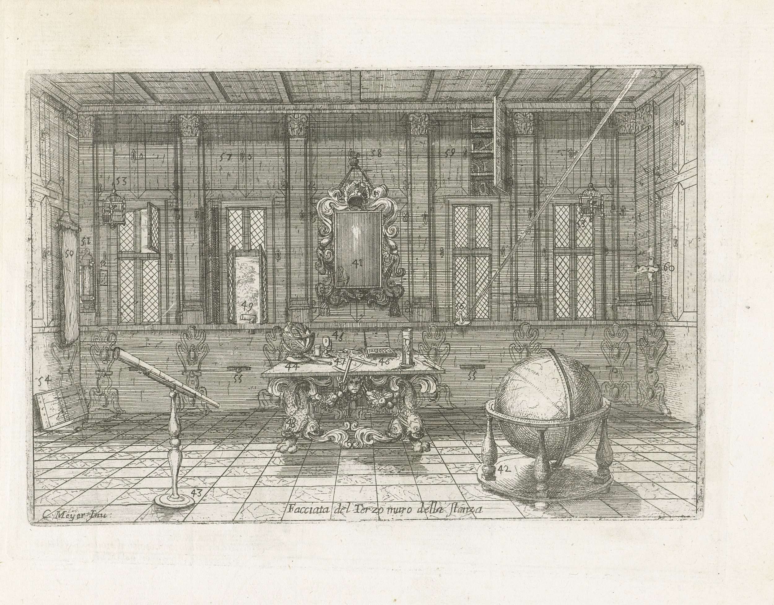 Aanzicht van een van de vier muren van een kamer, met diverse genummerde opbergmogelijkheden in en aan de wand. Links een telescoop en rechts een globe. Op een tafel een armillarium en een meetinstrument.