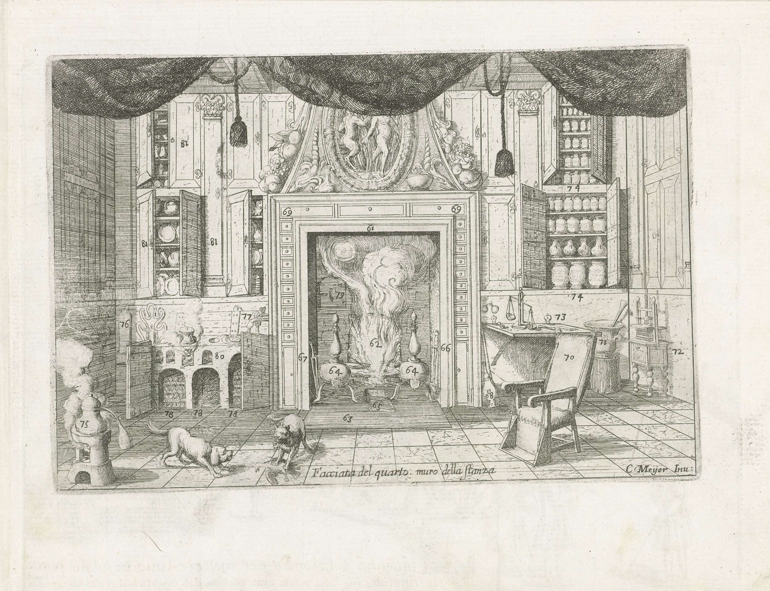 Aanzicht van een van de vier muren van een kamer, met diverse genummerde opbergmogelijkheden in de wand. In het midden een haard en een stoel. Op de voorgrond een hond en een kat met een dode vogel.