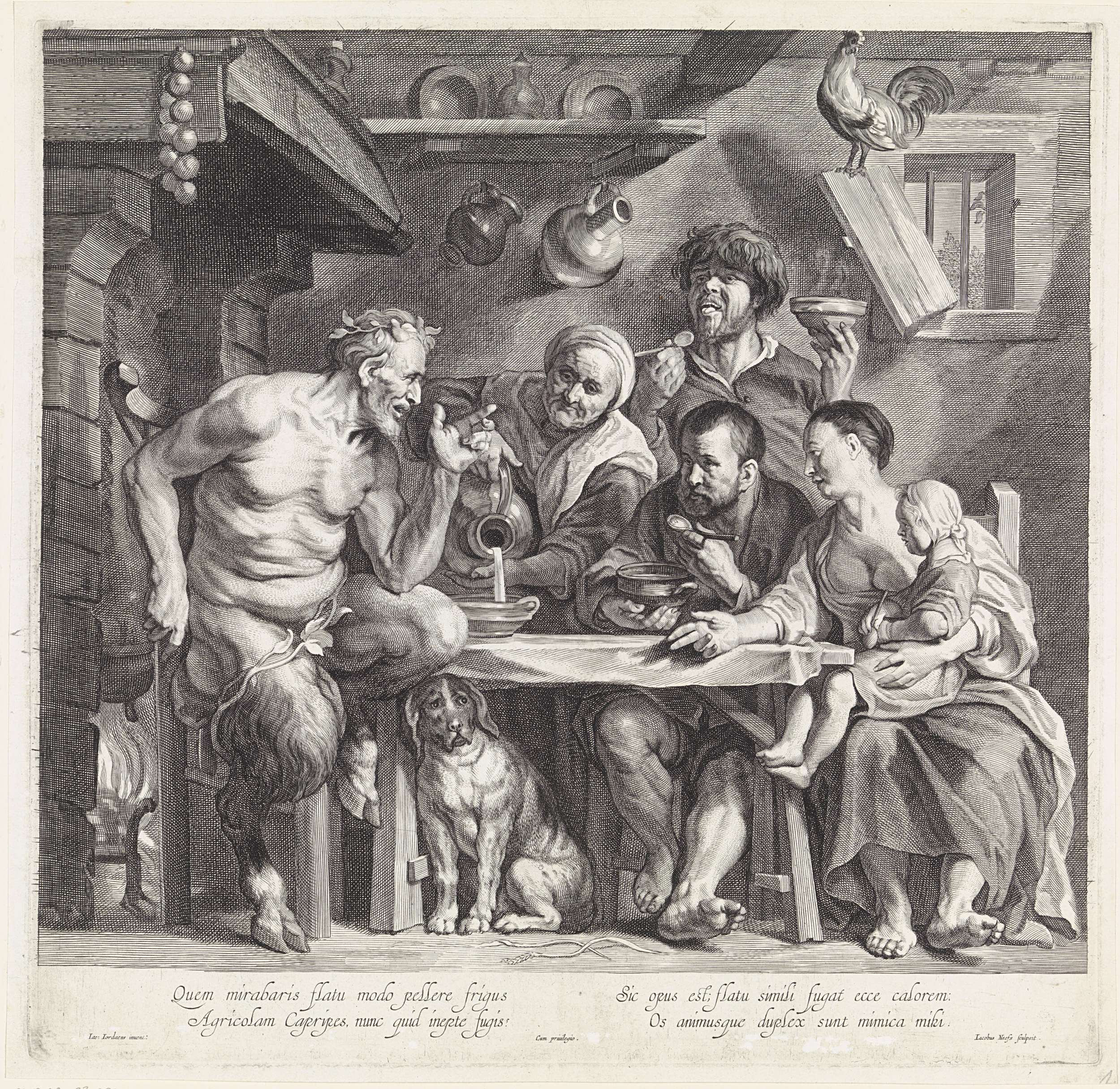 In een boereninterieur zitten een sater en zijn gezin aan tafel. Een oude vrouw giet soep in een kom voor de sater. Dit is de verbeelding van een fabel, waarin een reiziger te gast is bij een sater en zijn gezin. De gast blies eerst in zijn verkleumde handen en daarna in zijn kom soep. ...