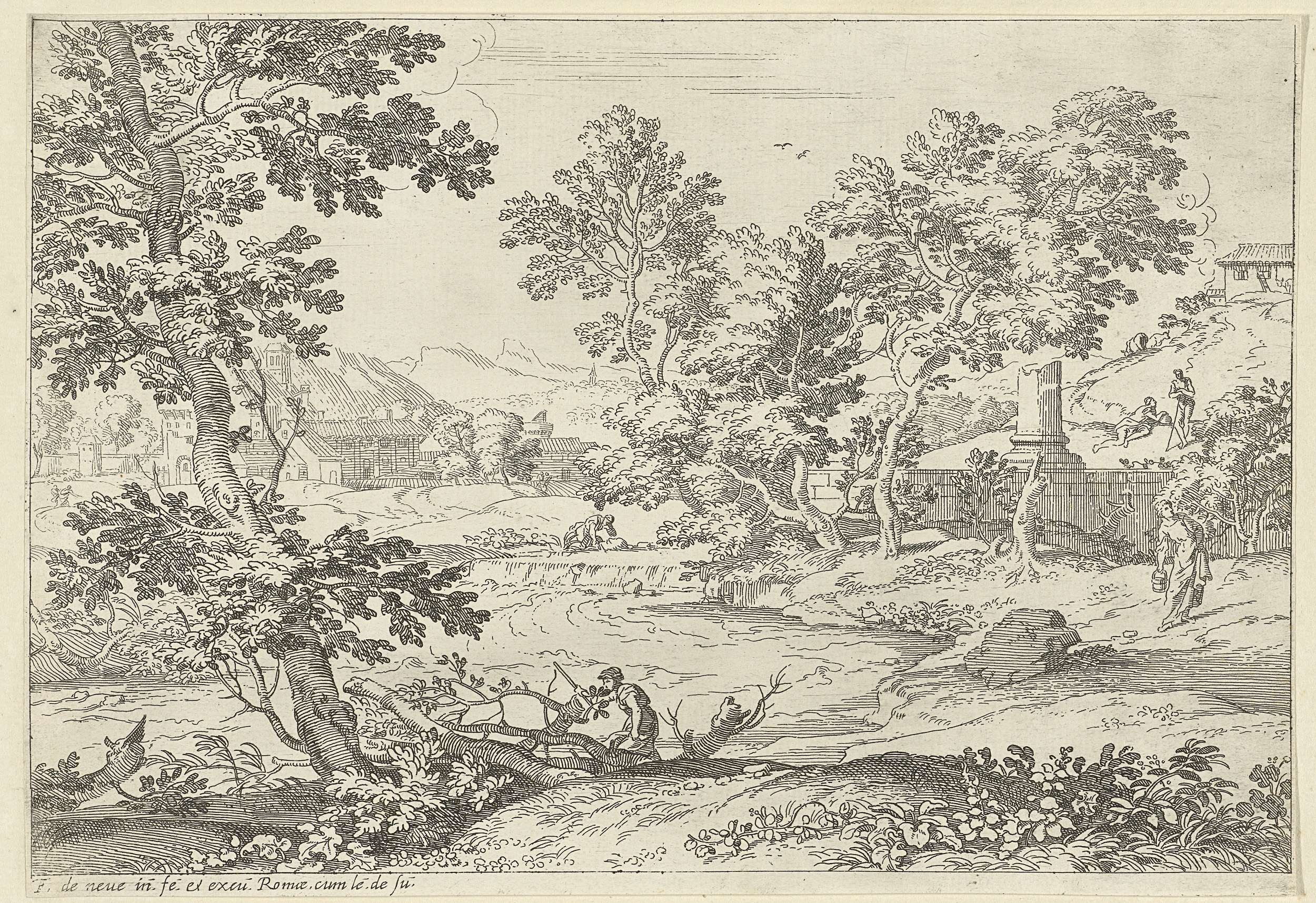 Landschap met een rivier, op de voorgrond links een boom. Rechts staat een vrouw met een emmer.