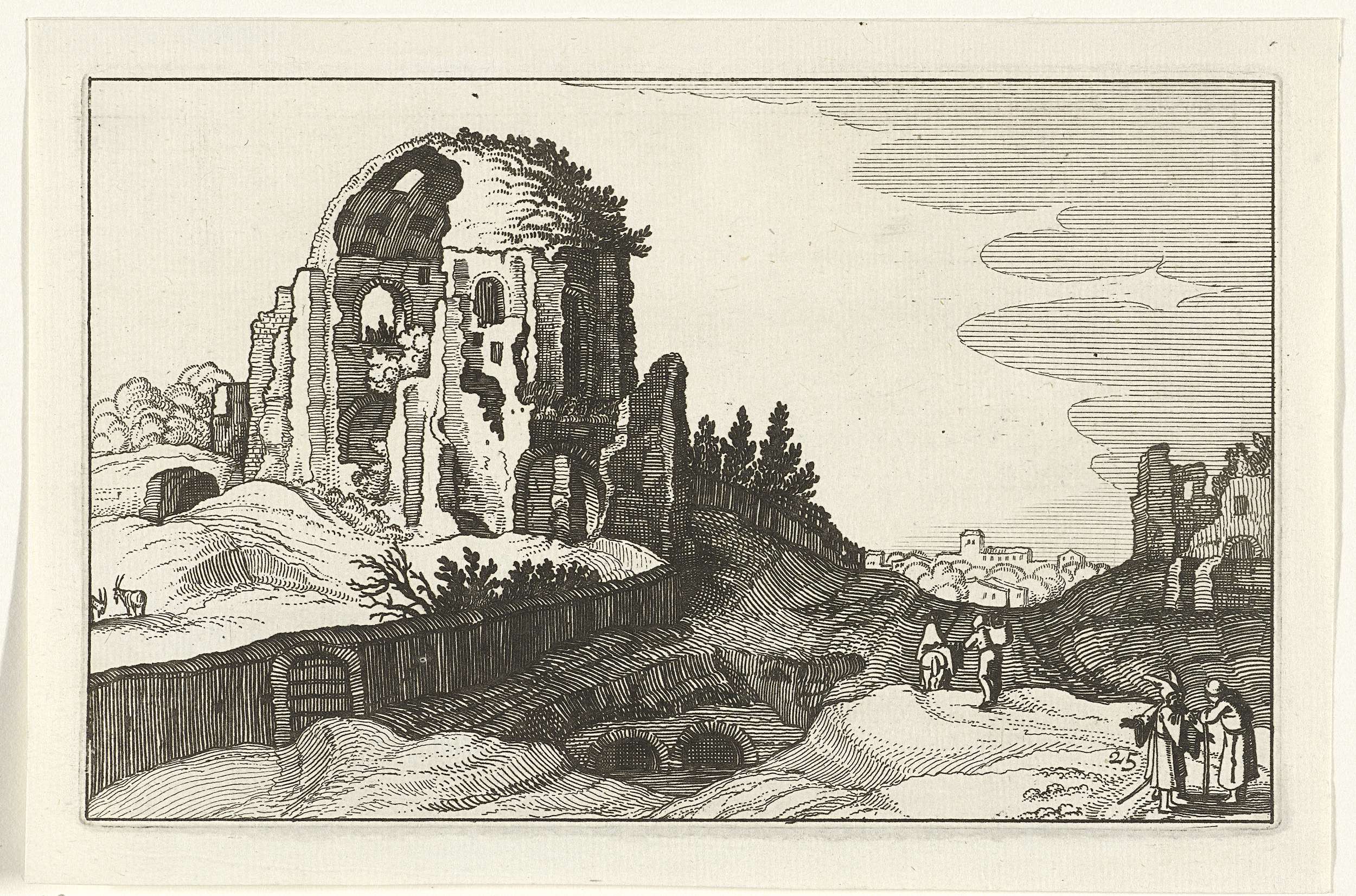De ruïne van het nymphaeum, ook bekend als de tempel van Minerva Medica, in Rome. Rechts een weg met enkele reizigers. Prent maakt deel uit van een serie Romeinse ruïnes en kustlandschappen naar een prentserie van Willem van Nieulandt.