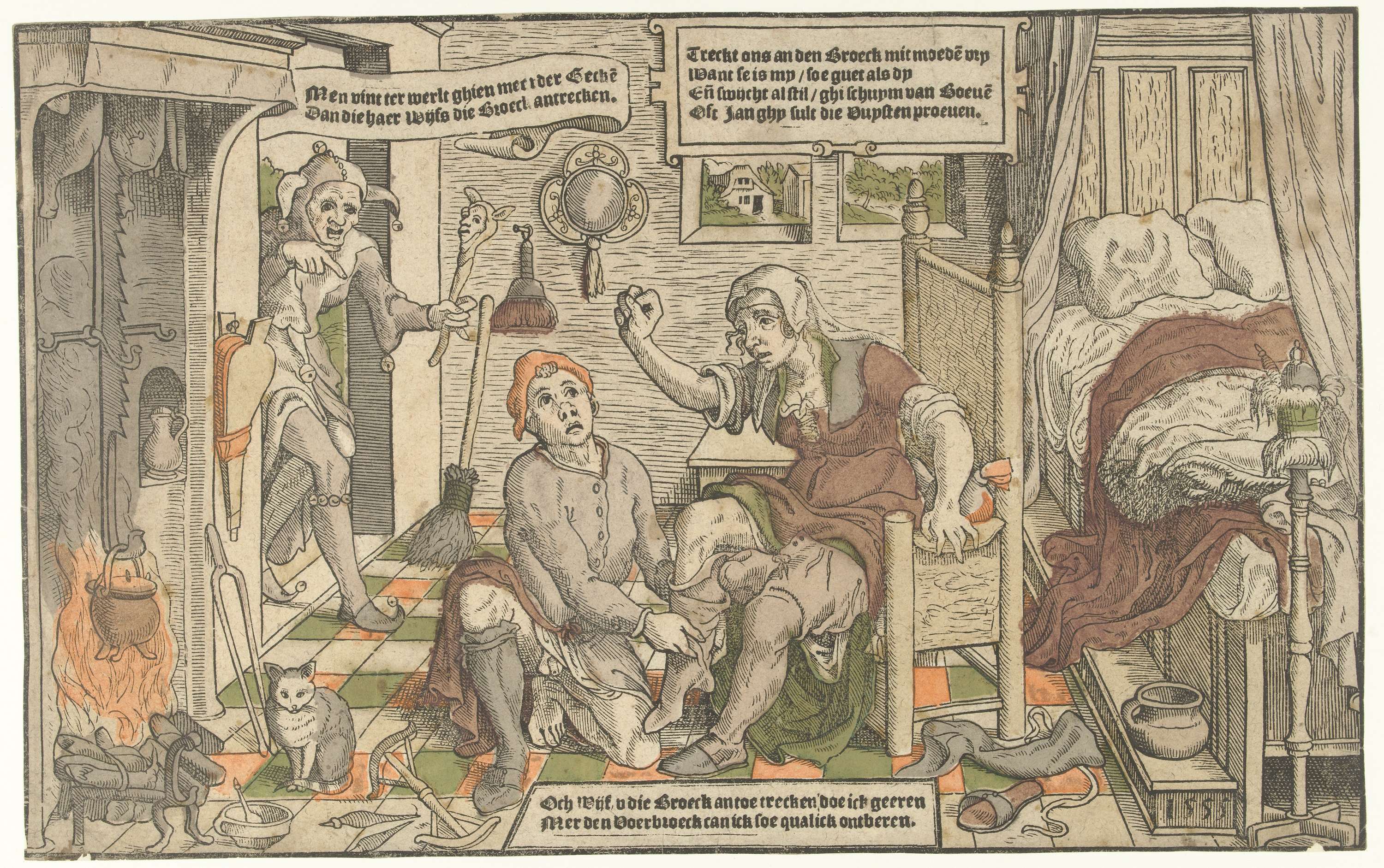Centsprent met verbeelding van spreekwoord. Kamer met bed en haard met ketel op het vuur. In midden van kamer vrouw op stoel gezeten. Man, geknield zonder broek aan, helpt vrouw in zijn broek. Nar komt binnen door deuropening. Alle drie de personen begeleid door tekst.