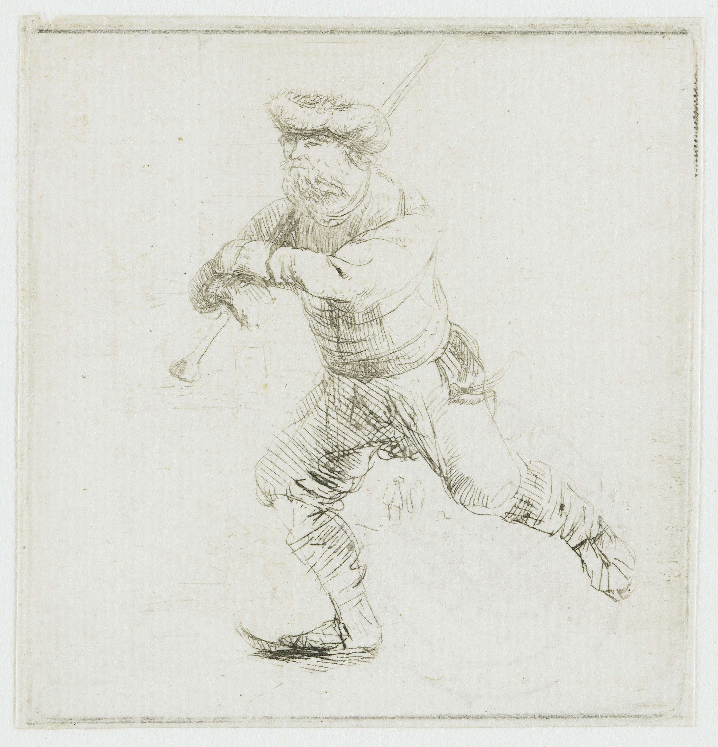 Eerst was Rembrandt vooral gefascineerd door armetierige drommels die van aalmoezen moeten leven. Daarna kreeg hij oog voor ander kleurrijk stadsvolk, dat hij meestal wel op hetzelfde minuscule formaat weergaf. Op deze zes etsjes verbeeldt hij een ouderwets geklede kwakzalver, twee Poolse soldaten, twee straatmuzikanten (een draailierspeler en een violist) en een schaatser.