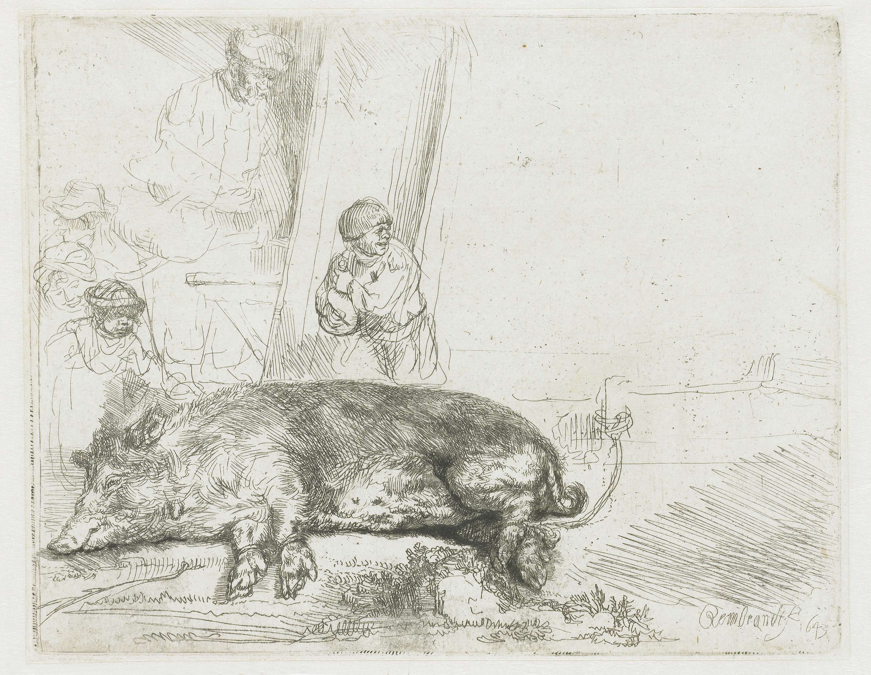 Mogelijk zag Rembrandt deze zeug op de Amsterdamse varkensmarkt. Hij maakte een gedetailleerde studie van het beest en zette die vervolgens in een verhalende context. Zo voegde hij met snelle lijnen een slager toe die de slacht voorbereidt, en een opgetogen jongetje spelend met een varkensblaas. Daarmee loopt Rembrandt nogal op de zaken vooruit, want ...