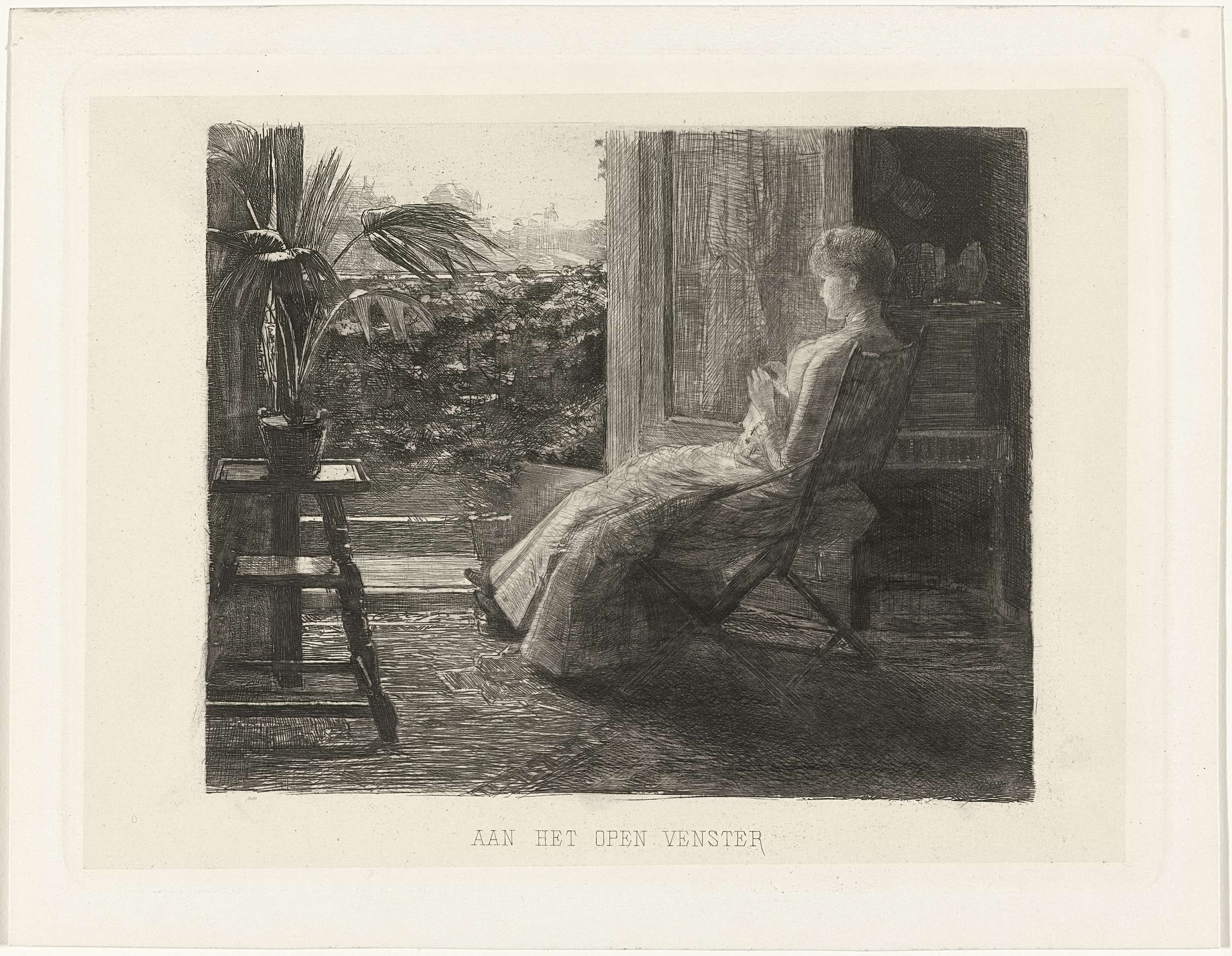 Een jonge vrouw zit met een borduurwerk voor de geopende deuren van het balkon. Naast haar staat op een krukje een kamerplant.