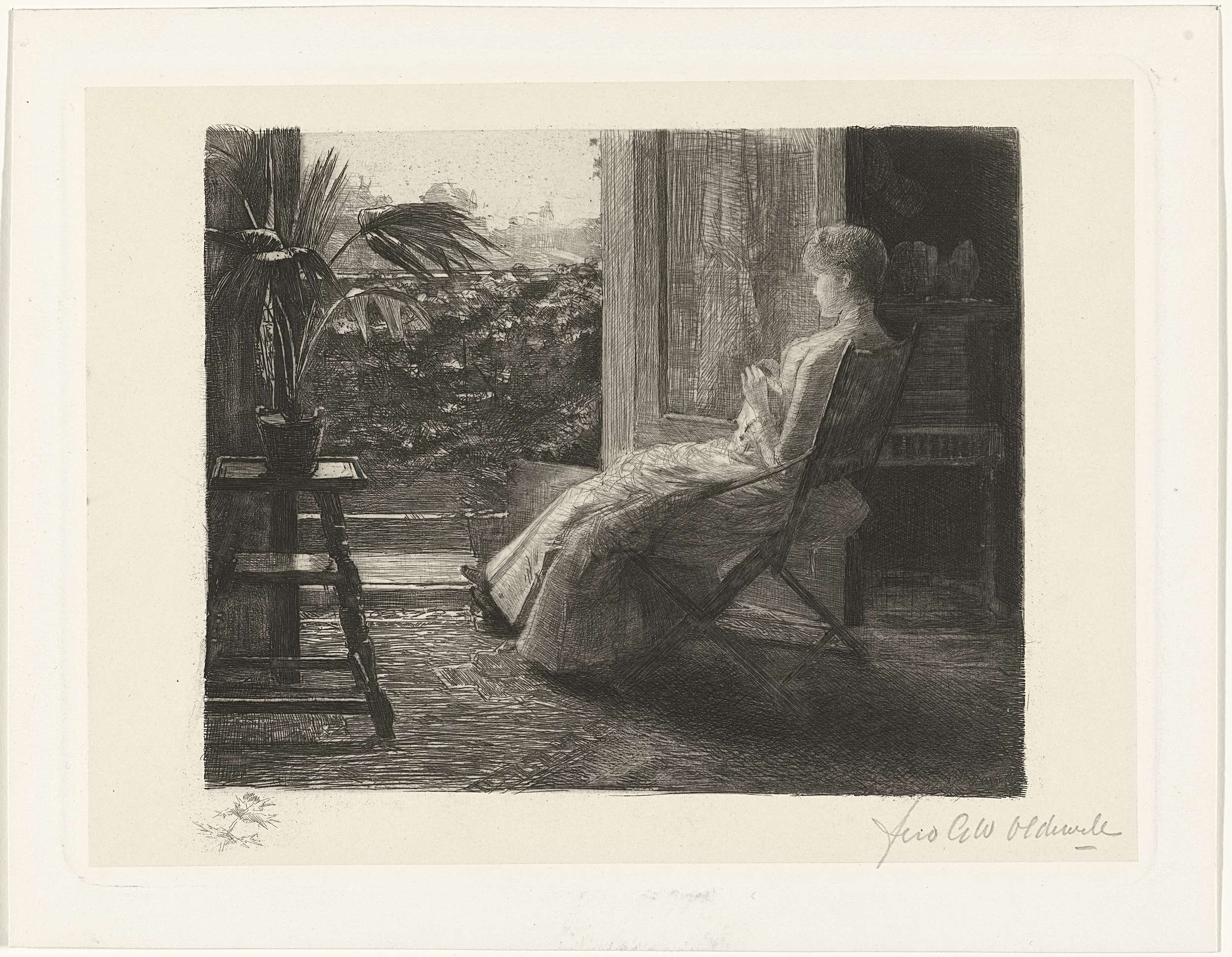 Een jonge vrouw zit met een borduurwerk voor de geopende deuren van het balkon. Naast haar staat op een krukje een kamerplant.