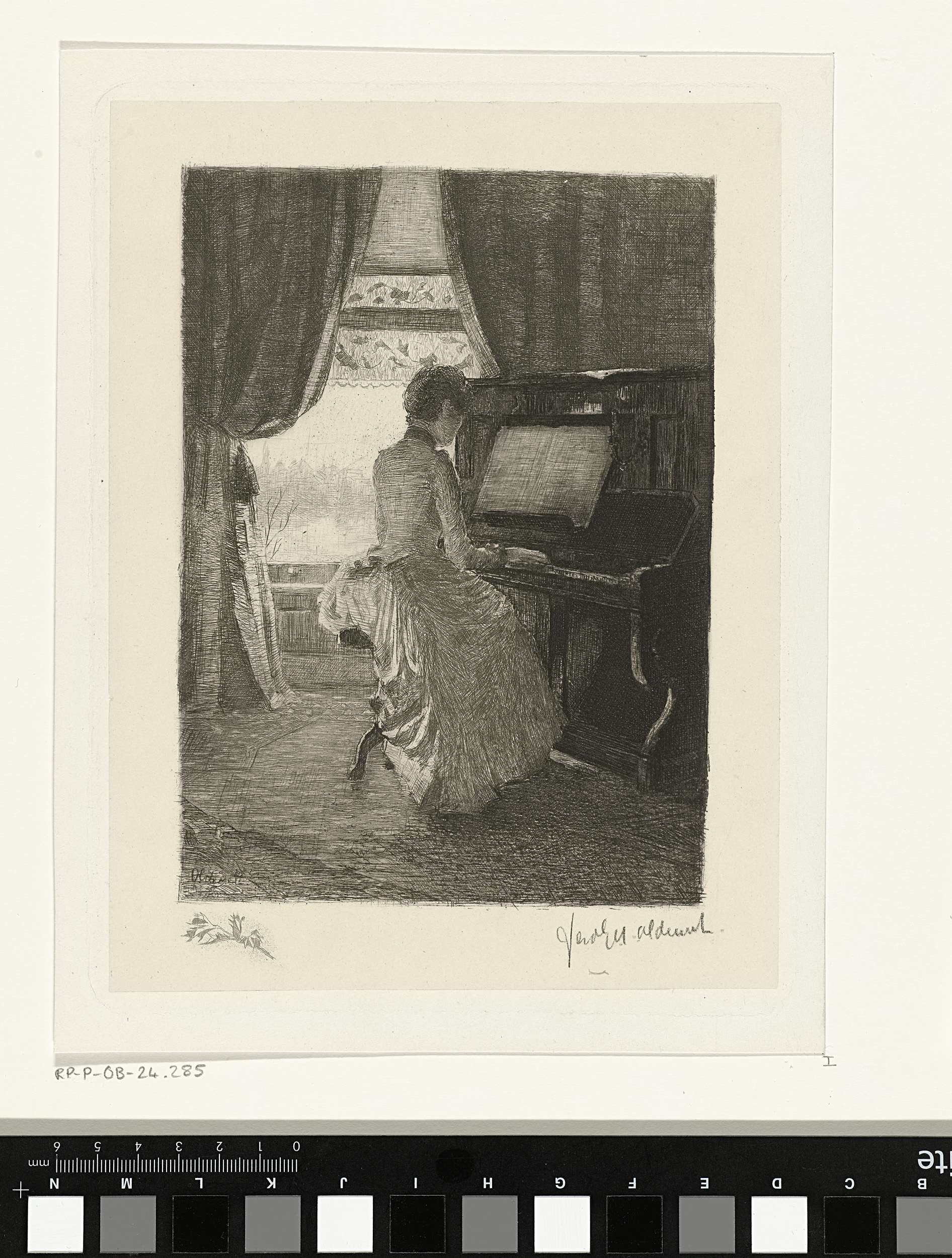 Een jonge vrouw (volgens een annotatie op een andere staat mevr. Koeleman-Van Wou) speelt piano. Op de achtergrond is door het raam een stadsgezicht herkenbaar.