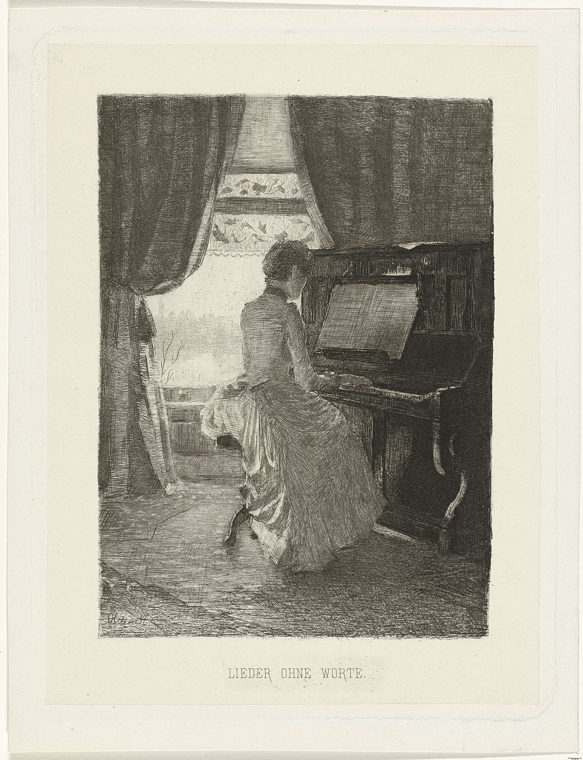 Een jonge vrouw (volgens een annotatie op een andere staat mevr. Koeleman-Van Wou) speelt piano. Op de achtergrond is door het raam een stadsgezicht herkenbaar.