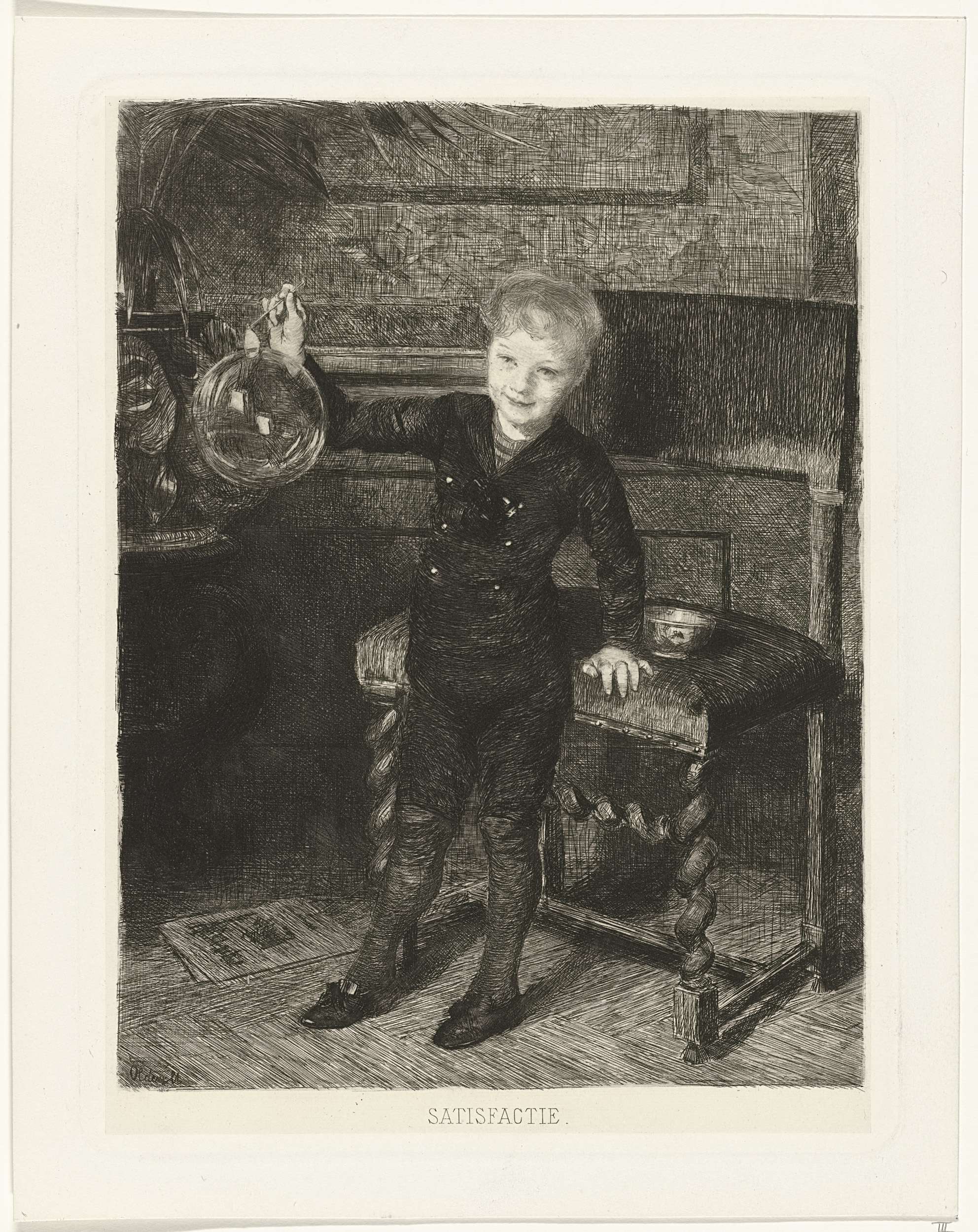 Portret van F.W.C.H. Oldewelt, zoon van de kunstenaar, als kind. Het jongetje leunt tegen een gestoffeerde stoel en toont trots een grote bel.