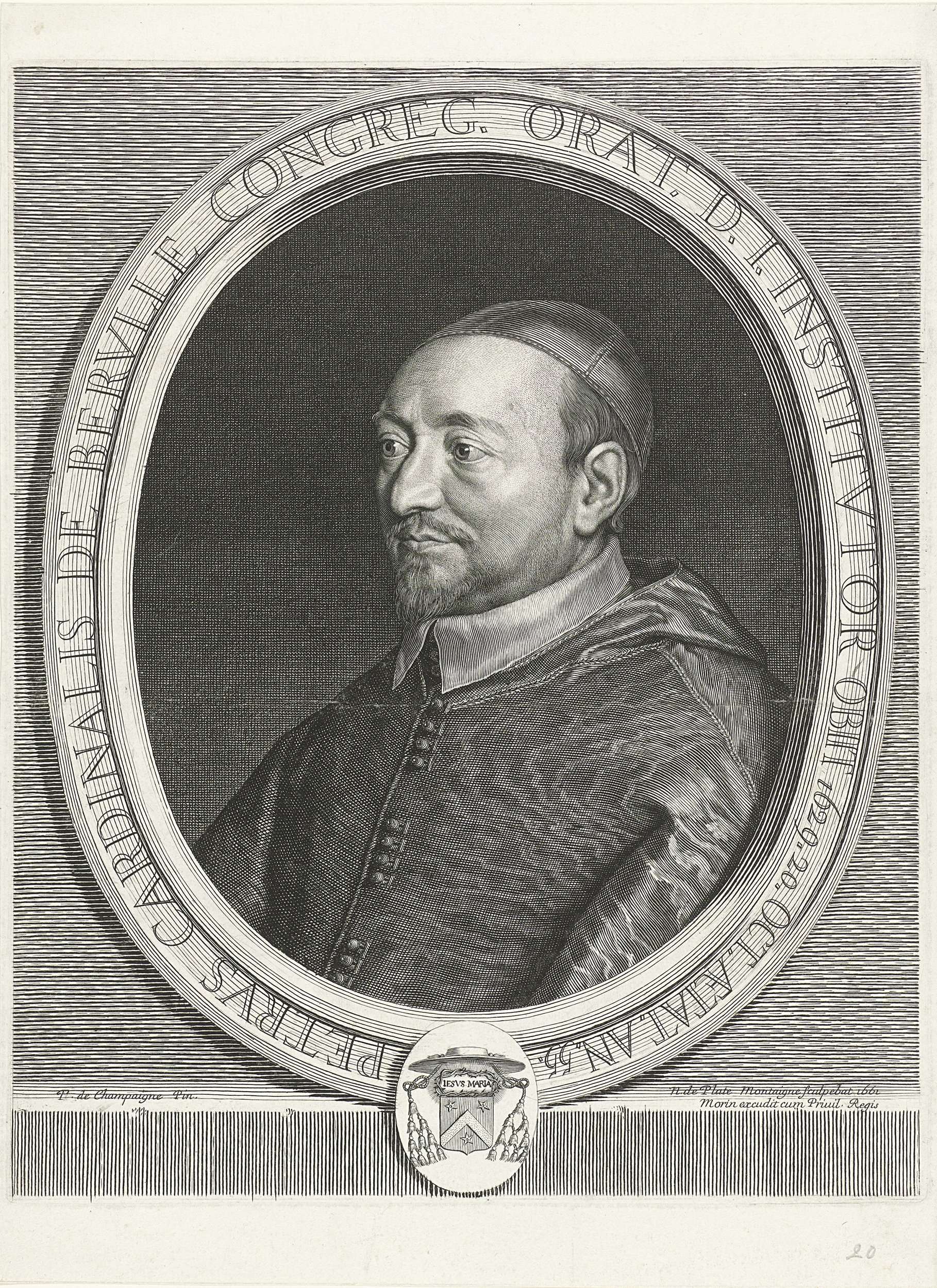 Portret van de Franse kardinaal Pierre de Bérulle. Onder de omlijsting zijn kardinaalswapen.