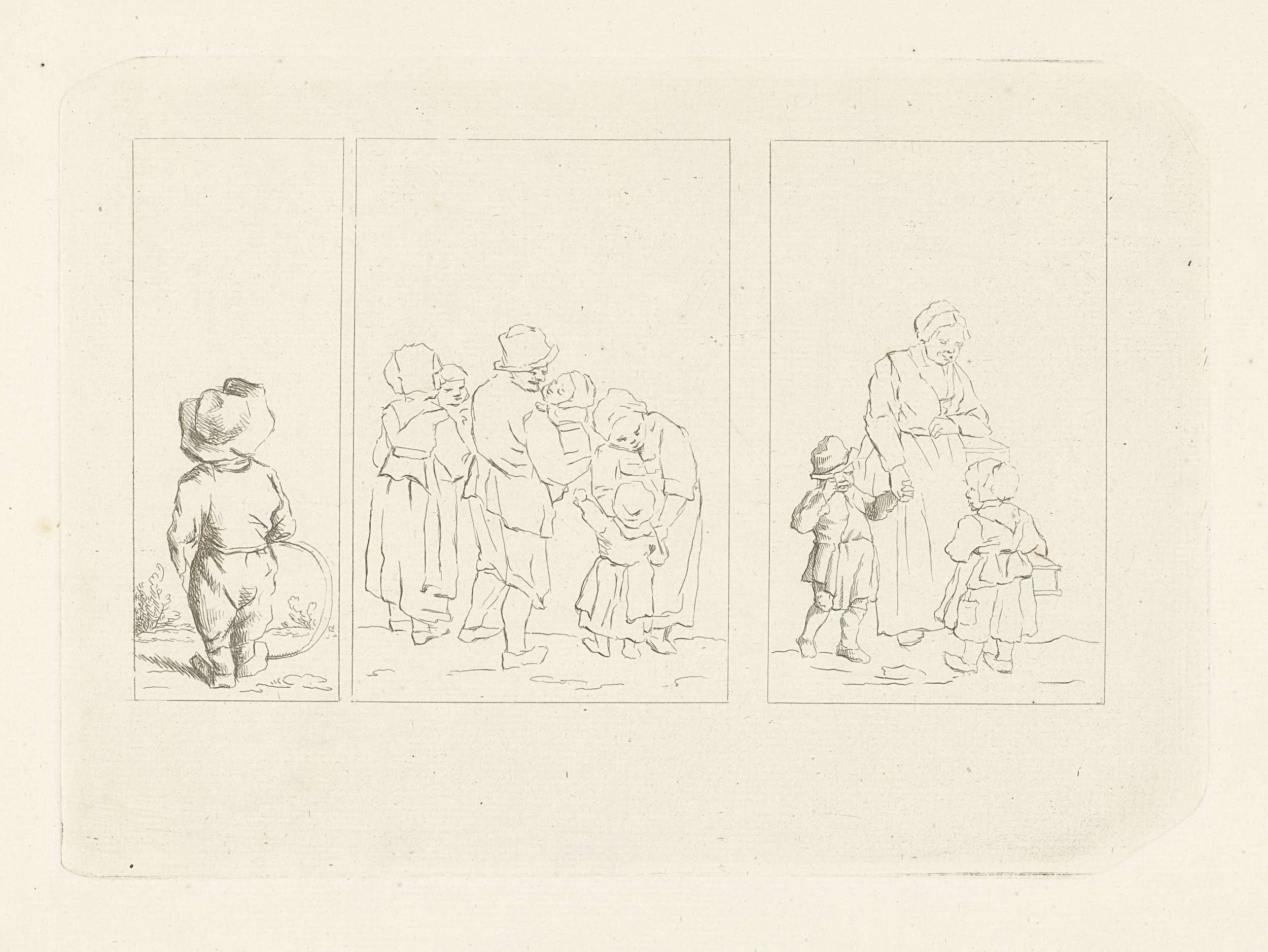 Drie voorstellingen van kinderen. Links: een jongen op de rug gezien, staande met een hoepel in de hand. Midden: een groep oudere kinderen, ieder met een jong kind op de arm. Rechts: een moeder met een huilende jongen aan de hand. Daarbij een meisje.
