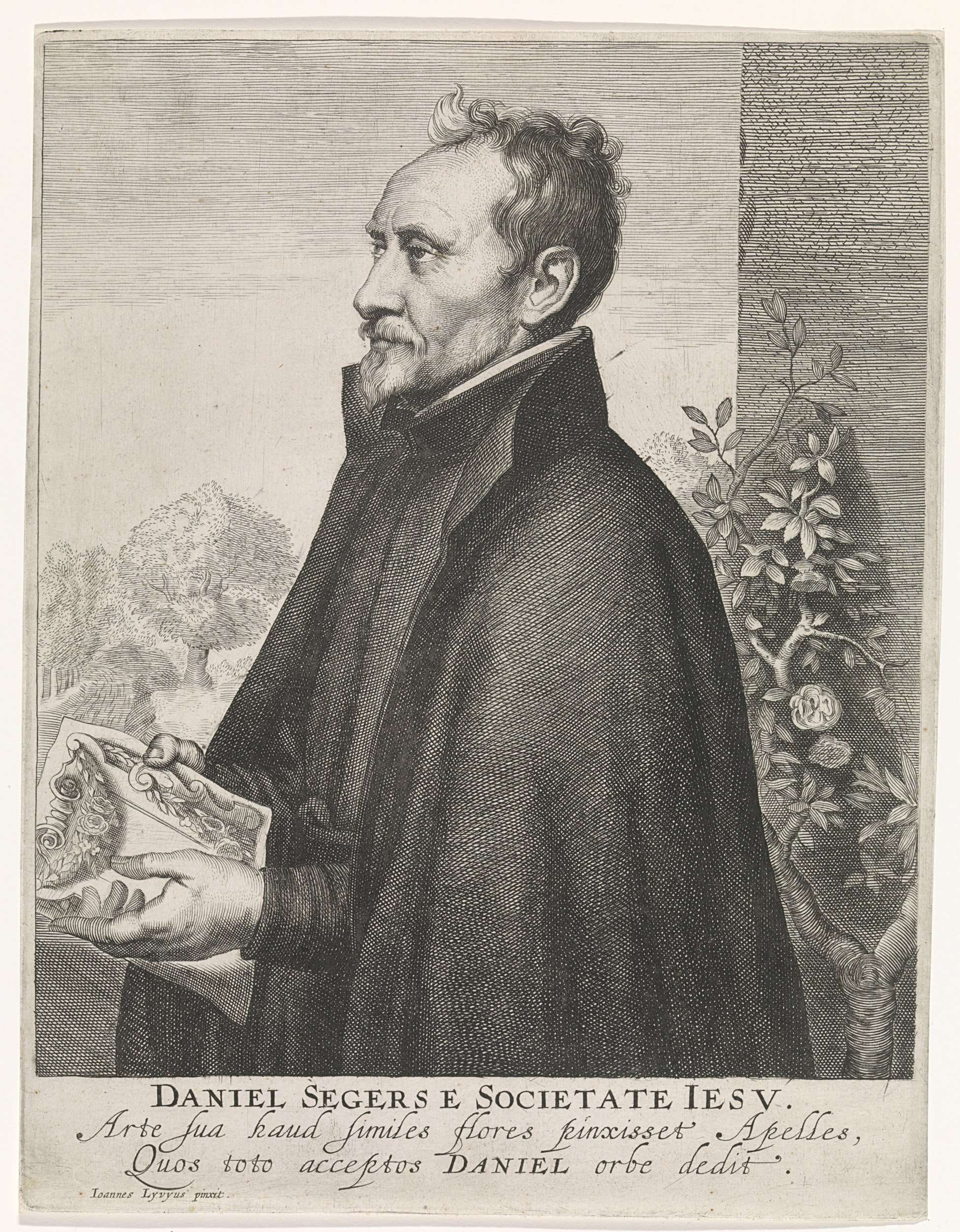 Portret van de schilder Daniël Seghers. In zijn hand houdt hij een prent. Achter hem een rozenstruik die verwijst naar de onderwerpkeuze van zijn schilderijen. In de marge een drieregelig onderschrift in het Latijn.