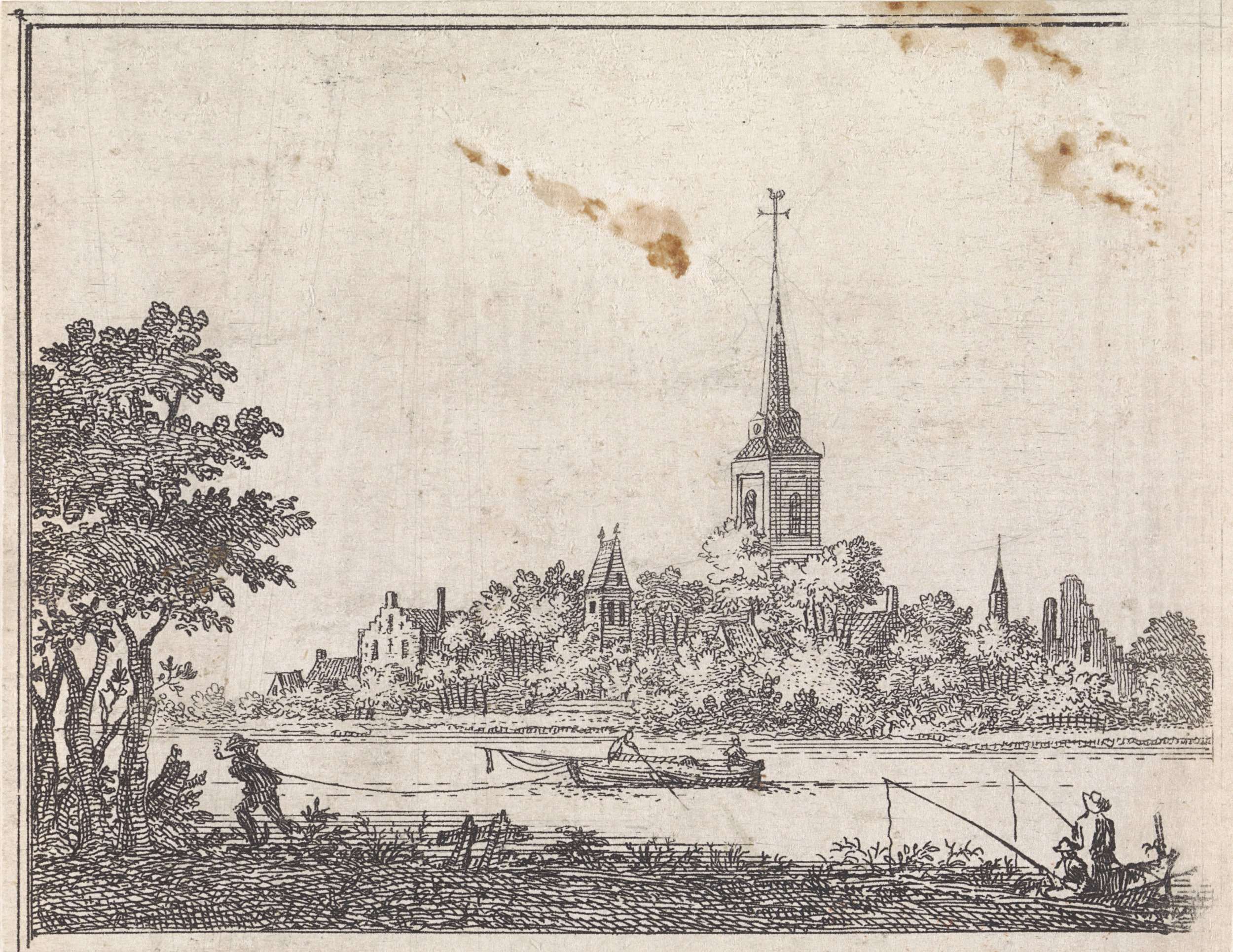 Gezicht op het dorp Rijnsburg. Op de voorgrond vissers en een trekschuit.