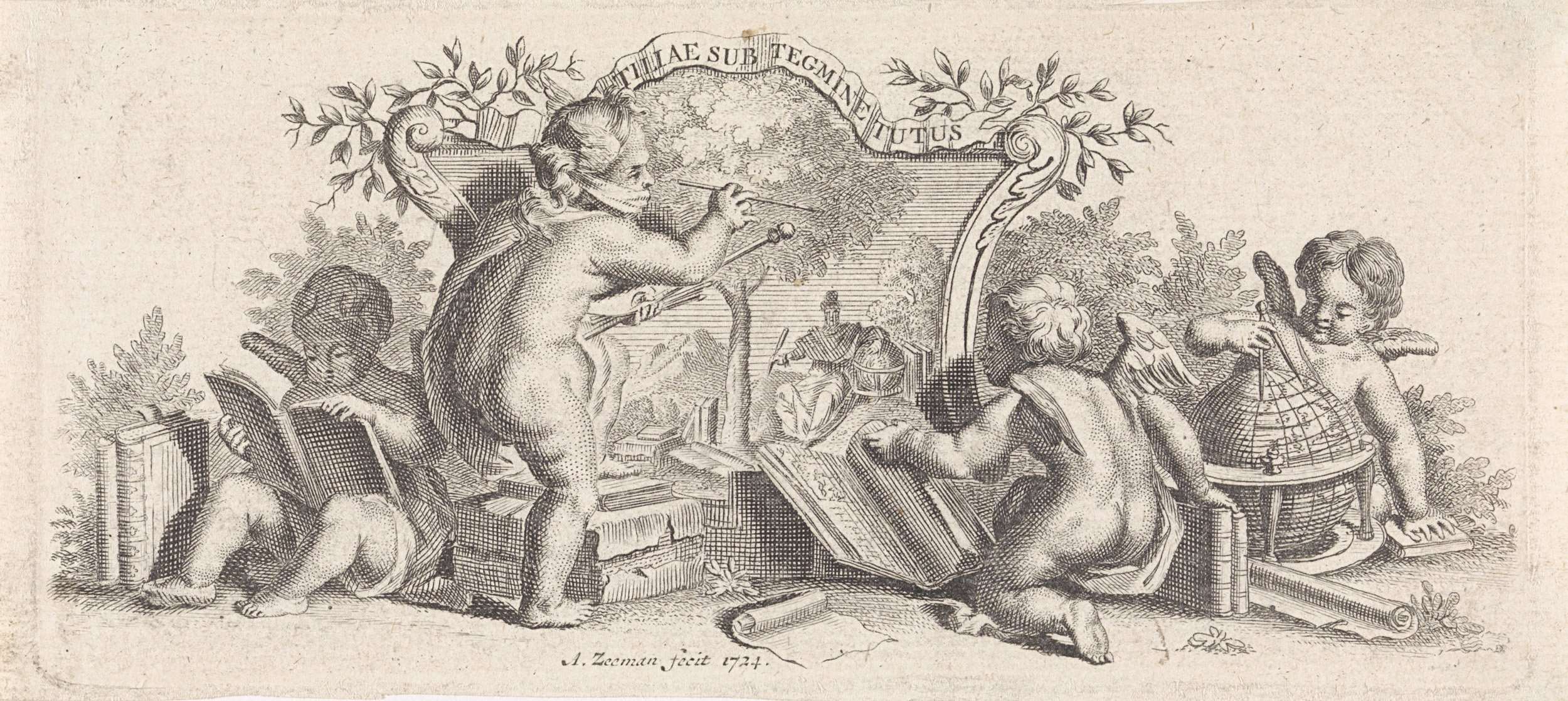Vier putti bijeen. Twee van hen lezen boeken. Een putto schildert een landschap met een schrijver naast een globe onder een boom. Een vierde putto meet met een passer de globe. Het vignet van uitgever en drukker Gerard onder de Linden. Midden boven zijn devies: Tiliae sub tegmine tutus.