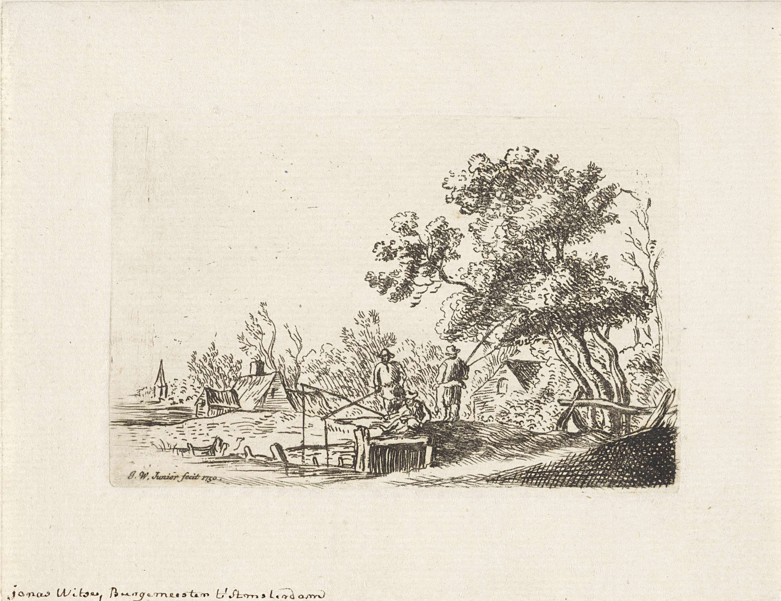Landschap met drie vissers bij een rivier. Langs het water staan twee huizen en een toren.