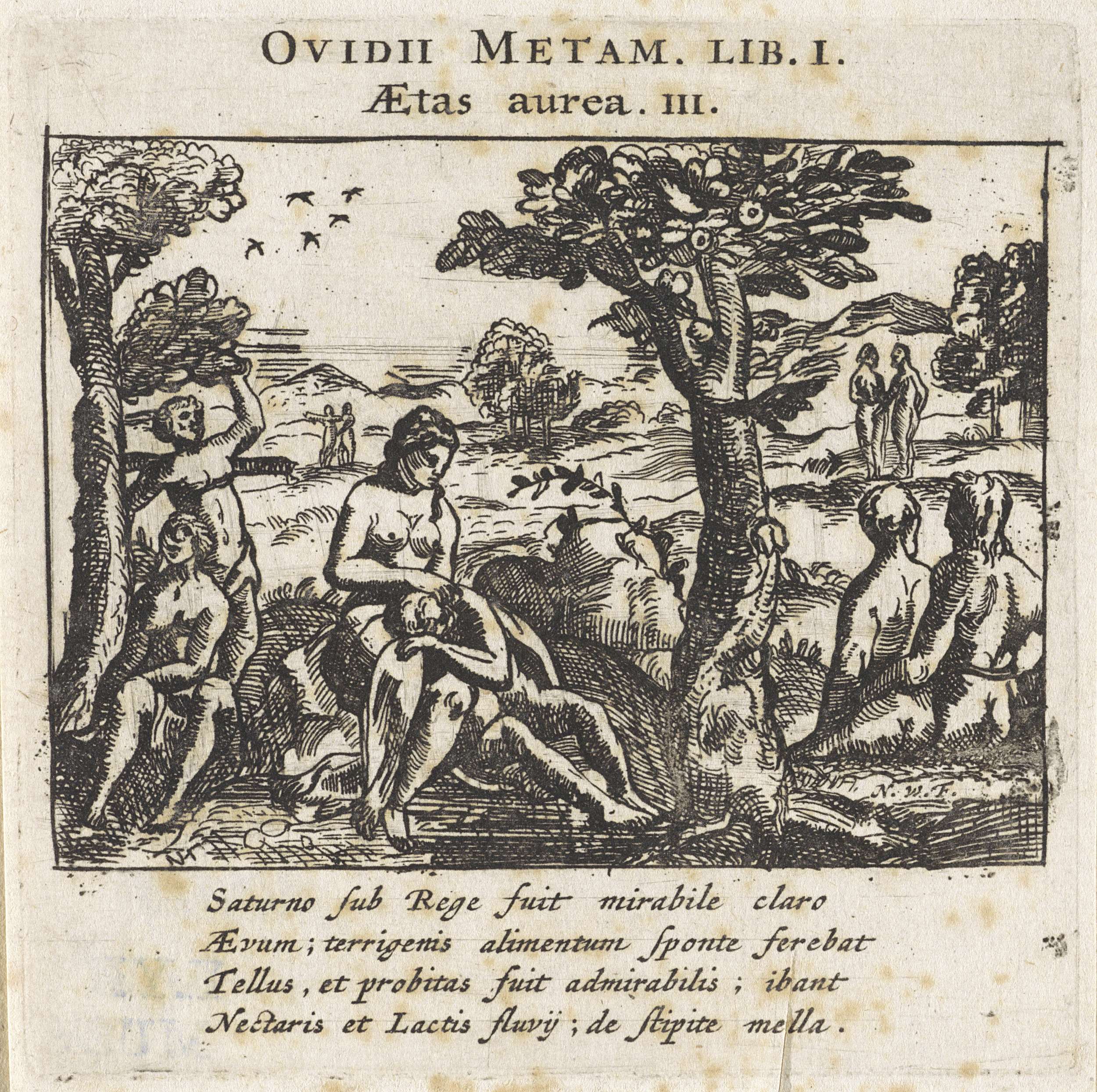 Verbeelding van het leven tijdens de Gouden Eeuw. Naakte mannen en vrouwen liefkozen elkaar en plukken vruchten in een idyllisch landschap. Onder de voorstelling een vierregelige toelichting in het Latijn.
