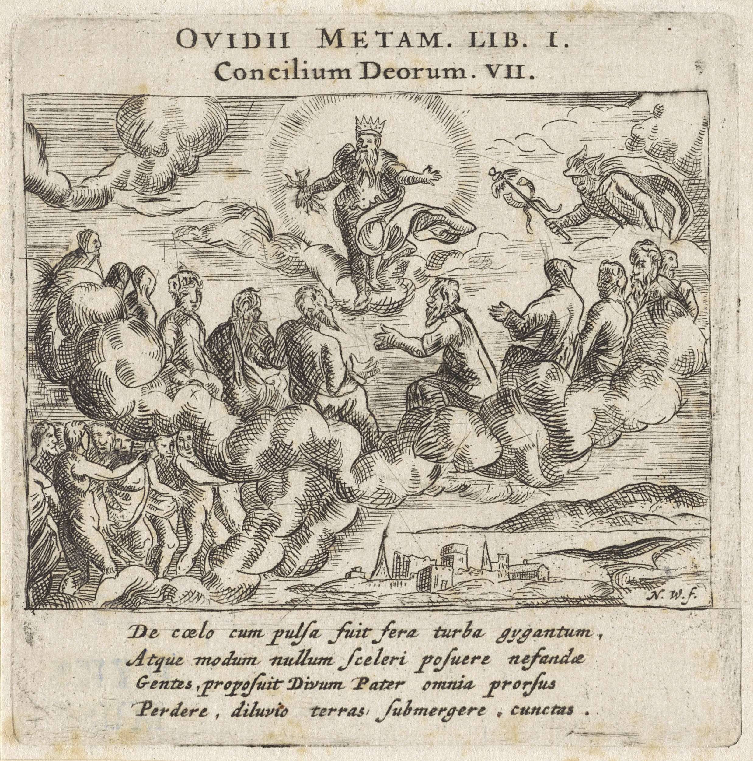 Jupiter staat voor de zon en heeft bliksemstralen in zijn hand. Voor hem zitten de andere Olympische goden, die door Jupiter om raad worden gevraagd. Onder de voorstelling een vierregelige toelichting in het Latijn.